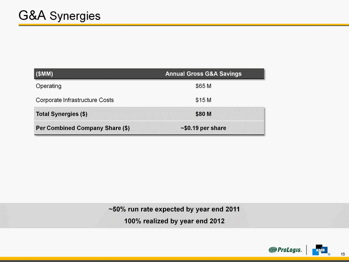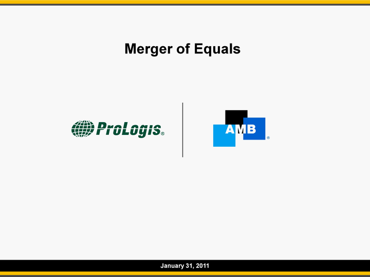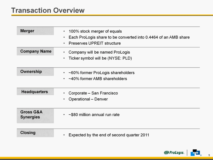 | Transaction Overview Company will be named ProLogis Ticker symbol will be (NYSE: PLD) ~60% former ProLogis shareholders ~40% former AMB shareholders Corporate - San Francisco Operational - Denver ~$80 million annual run rate Expected by the end of second quarter 2011 100% stock merger of equals Each ProLogis share to be converted into 0.4464 of an AMB share Preserves UPREIT structure Merger Company Name Ownership Headquarters Gross G&A Synergies Closing |