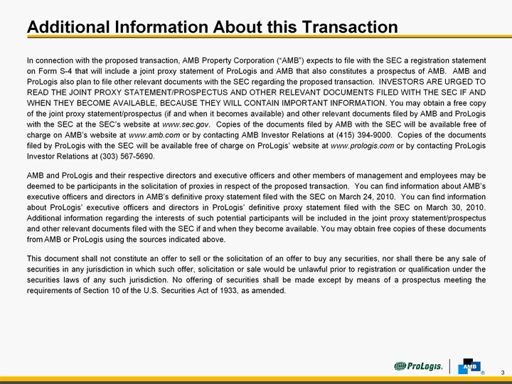 | Additional Information About this Transaction In connection with the proposed transaction, AMB Property Corporation ("AMB") expects to file with the SEC a registration statement on Form S-4 that will include a joint proxy statement of ProLogis and AMB that also constitutes a prospectus of AMB. AMB and ProLogis also plan to file other relevant documents with the SEC regarding the proposed transaction. INVESTORS ARE URGED TO READ THE JOINT PROXY STATEMENT/PROSPECTUS AND OTHER RELEVANT DOCUMENTS FILED WITH THE SEC IF AND WHEN THEY BECOME AVAILABLE, BECAUSE THEY WILL CONTAIN IMPORTANT INFORMATION. You may obtain a free copy of the joint proxy statement/prospectus (if and when it becomes available) and other relevant documents filed by AMB and ProLogis with the SEC at the SEC's website at www.sec.gov. Copies of the documents filed by AMB with the SEC will be available free of charge on AMB's website at www.amb.com or by contacting AMB Investor Relations at (415) 394-9000. Copies of the documents filed by ProLogis with the SEC will be available free of charge on ProLogis' website at www.prologis.com or by contacting ProLogis Investor Relations at (303) 567-5690. AMB and ProLogis and their respective directors and executive officers and other members of management and employees may be deemed to be participants in the solicitation of proxies in respect of the proposed transaction. You can find information about AMB's executive officers and directors in AMB's definitive proxy statement filed with the SEC on March 24, 2010. You can find information about ProLogis' executive officers and directors in ProLogis' definitive proxy statement filed with the SEC on March 30, 2010. Additional information regarding the interests of such potential participants will be included in the joint proxy statement/prospectus and other relevant documents filed with the SEC if and when they become available. You may obtain free copies of these documents from AMB or ProLogis using the sources indicated above. This document shall not constitute an offer to sell or the solicitation of an offer to buy any securities, nor shall there be any sale of securities in any jurisdiction in which such offer, solicitation or sale would be unlawful prior to registration or qualification under the securities laws of any such jurisdiction. No offering of securities shall be made except by means of a prospectus meeting the requirements of Section 10 of the U.S. Securities Act of 1933, as amended. |