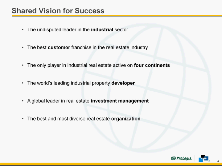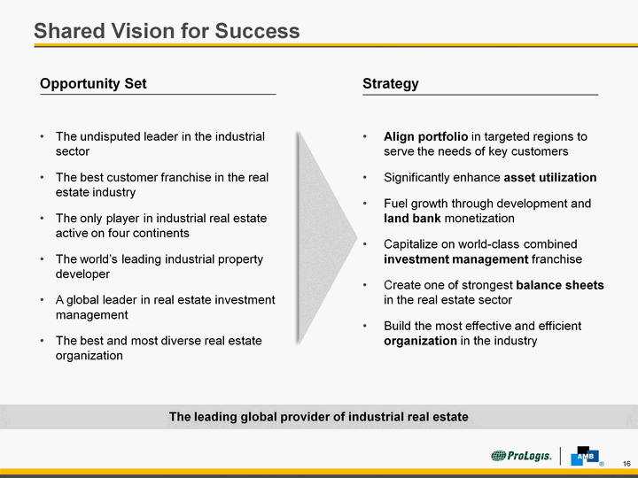 | Shared Vision for Success Opportunity Set The undisputed leader in the industrial sector The best customer franchise in the real estate industry The only player in industrial real estate active on four continents The world's leading industrial property developer A global leader in real estate investment management The best and most diverse real estate organization Strategy Align portfolio in targeted regions to serve the needs of key customers Significantly enhance asset utilization Fuel growth through development and land bank monetization Capitalize on world-class combined investment management franchise Create one of strongest balance sheets in the real estate sector Build the most effective and efficient organization in the industry The leading global provider of industrial real estate |