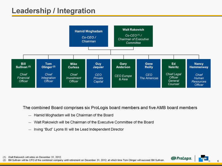 | Leadership / Integration The combined Board comprises six ProLogis board members and five AMB board members Hamid Moghadam will be Chairman of the Board Walt Rakowich will be Chairman of the Executive Committee of the Board Irving "Bud" Lyons III will be Lead Independent Director Walt Rakowich Co-CEO (1) / Chairman of Executive Committee Hamid Moghadam Co-CEO / Chairman (1) Walt Rakowich will retire on December 31, 2012. (2) Bill Sullivan will be CFO of the combined company until retirement on December 31, 2012, at which time Tom Olinger will succeed Bill Sullivan. Bill Sullivan (2) Chief Financial Officer Tom Olinger (2) Chief Integration Officer Guy Jaquier CEO Private Capital Gary Anderson CEO Europe & Asia Gene Reilly CEO The Americas Ed Nekritz Chief Legal Officer General Counsel Nancy Hemmenway Chief Human Resources Officer Mike Curless Chief Investment Officer |
