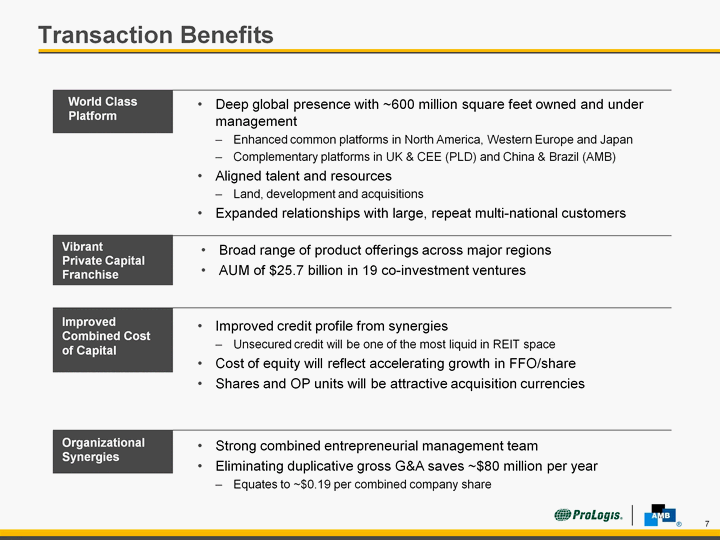 | Transaction Benefits Improved credit profile from synergies Unsecured credit will be one of the most liquid in REIT space Cost of equity will reflect accelerating growth in FFO/share Shares and OP units will be attractive acquisition currencies Deep global presence with ~600 million square feet owned and under management Enhanced common platforms in North America, Western Europe and Japan Complementary platforms in UK & CEE (PLD) and China & Brazil (AMB) Aligned talent and resources Land, development and acquisitions Expanded relationships with large, repeat multi-national customers Strong combined entrepreneurial management team Eliminating duplicative gross G&A saves ~$80 million per year Equates to ~$0.19 per combined company share Broad range of product offerings across major regions AUM of $25.7 billion in 19 co-investment ventures World Class Platform Vibrant Private Capital Franchise Improved Combined Cost of Capital Organizational Synergies |