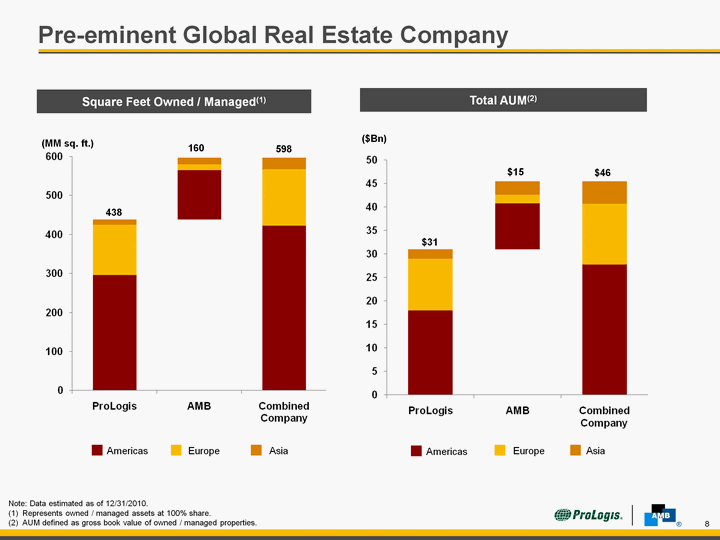 | Pre-eminent Global Real Estate Company (MM sq. ft.) Asia Americas Europe ($Bn) Note: Data estimated as of 12/31/2010. (1) Represents owned / managed assets at 100% share. (2) AUM defined as gross book value of owned / managed properties. 438 160 598 Square Feet Owned / Managed(1) Total AUM(2) $31 $15 $46 Asia Americas Europe |