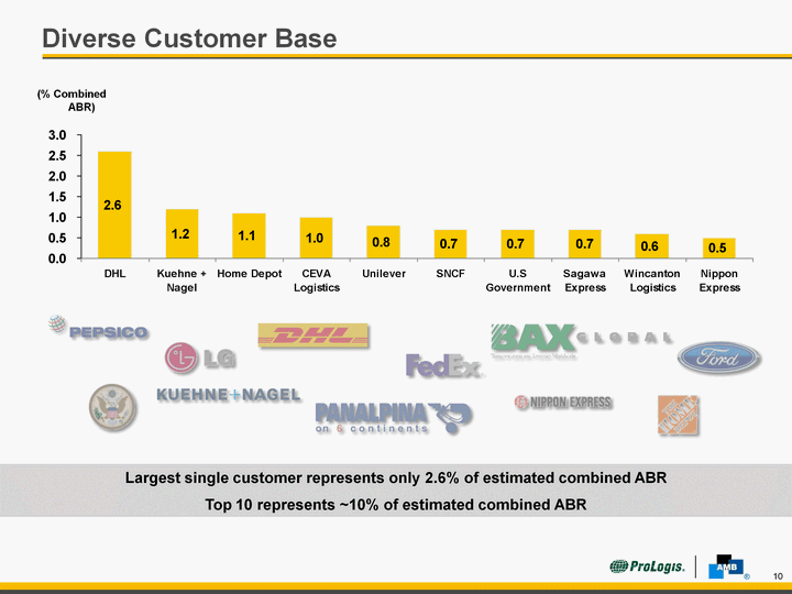 | Diverse Customer Base (% Combined ABR) Largest single customer represents only 2.6% of estimated combined ABR Top 10 represents ~10% of estimated combined ABR |