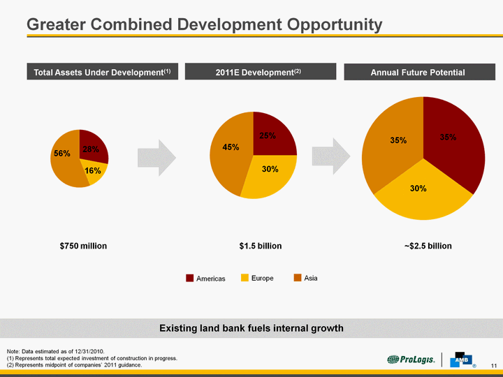 | Greater Combined Development Opportunity $750 million $1.5 billion Total Assets Under Development(1) 2011E Development(2) Note: Data estimated as of 12/31/2010. (1) Represents total expected investment of construction in progress. (2) Represents midpoint of companies' 2011 guidance. Annual Future Potential ~$2.5 billion Existing land bank fuels internal growth Americas Europe 30% 45% 25% 30% 35% 35% 16% 56% 28% |