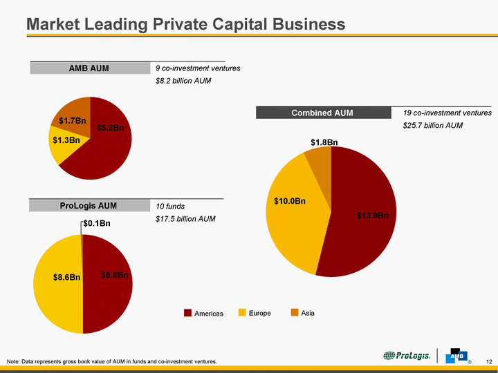 | $0.1Bn $8.8Bn $8.6Bn Market Leading Private Capital Business Note: Data represents gross book value of AUM in funds and co-investment ventures. Combined AUM 19 co-investment ventures $25.7 billion AUM $13.9Bn $10.0Bn $1.8Bn 9 co-investment ventures $8.2 billion AUM AMB AUM $1.3Bn $1.7Bn $5.2Bn 10 funds $17.5 billion AUM ProLogis AUM Americas Europe |