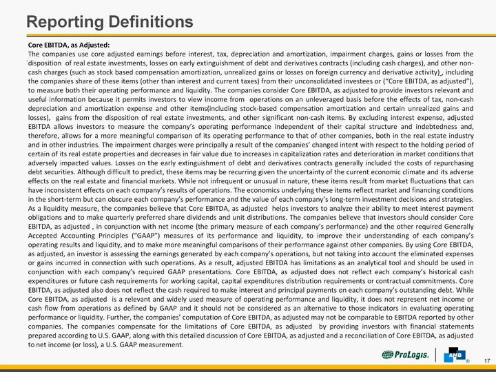 | Reporting Definitions .. Core EBITDA, as Adjusted: The companies use core adjusted earnings before interest, tax, depreciation and amortization, impairment charges, gains or losses from the disposition of real estate investments, losses on early extinguishment of debt and derivatives contracts (including cash charges), and other non- cash charges (such as stock based compensation amortization, unrealized gains or losses on foreign currency and derivative activity) , including the companies share of these items (other than interest and current taxes) from their unconsolidated investees or ("Core EBITDA, as adjusted"), to measure both their operating performance and liquidity. The companies consider Core EBITDA, as adjusted to provide investors relevant and useful information because it permits investors to view income from operations on an unleveraged basis before the effects of tax, non-cash depreciation and amortization expense and other items(including stock-based compensation amortization and certain unrealized gains and losses), gains from the disposition of real estate investments, and other significant non-cash items. By excluding interest expense, adjusted EBITDA allows investors to measure the company's operating performance independent of their capital structure and indebtedness and, therefore, allows for a more meaningful comparison of its operating performance to that of other companies, both in the real estate industry and in other industries. The impairment charges were principally a result of the companies' changed intent with respect to the holding period of certain of its real estate properties and decreases in fair value due to increases in capitalization rates and deterioration in market conditions that adversely impacted values. Losses on the early extinguishment of debt and derivatives contracts generally included the costs of repurchasing debt securities. Although difficult to predict, these items may be recurring given the uncertainty of the current economic climate and its adverse effects on the real estate and financial markets. While not infrequent or unusual in nature, these items result from market fluctuations that can have inconsistent effects on each company's results of operations. The economics underlying these items reflect market and financing conditions in the short-term but can obscure each company's performance and the value of each company's long-term investment decisions and strategies. As a liquidity measure, the companies believe that Core EBITDA, as adjusted helps investors to analyze their ability to meet interest payment obligations and to make quarterly preferred share dividends and unit distributions. The companies believe that investors should consider Core EBITDA, as adjusted , in conjunction with net income (the primary measure of each company's performance) and the other required Generally Accepted Accounting Principles ("GAAP") measures of its performance and liquidity, to improve their understanding of each company's operating results and liquidity, and to make more meaningful comparisons of their performance against other companies. By using Core EBITDA, as adjusted, an investor is assessing the earnings generated by each company's operations, but not taking into account the eliminated expenses or gains incurred in connection with such operations. As a result, adjusted EBITDA has limitations as an analytical tool and should be used in conjunction with each company's required GAAP presentations. Core EBITDA, as adjusted does not reflect each company's historical cash expenditures or future cash requirements for working capital, capital expenditures distribution requirements or contractual commitments. Core EBITDA, as adjusted also does not reflect the cash required to make interest and principal payments on each company's outstanding debt. While Core EBITDA, as adjusted is a relevant and widely used measure of operating performance and liquidity, it does not represent net income or cash flow from operations as defined by GAAP and it should not be considered as an alternative to those indicators in evaluating operating performance or liquidity. Further, the companies' computation of Core EBITDA, as adjusted may not be comparable to EBITDA reported by other companies. The companies compensate for the limitations of Core EBITDA, as adjusted by providing investors with financial statements prepared according to U.S. GAAP, along with this detailed discussion of Core EBITDA, as adjusted and a reconciliation of Core EBITDA, as adjusted to net income (or loss), a U.S. GAAP measurement. |