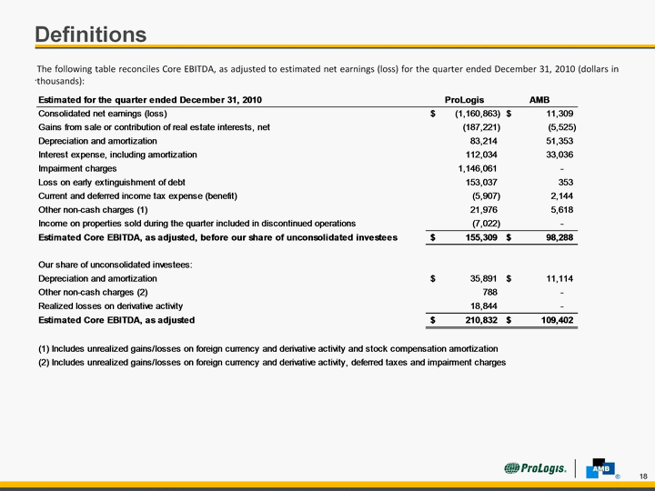 | Definitions .. The following table reconciles Core EBITDA, as adjusted to estimated net earnings (loss) for the quarter ended December 31, 2010 (dollars in thousands): |
