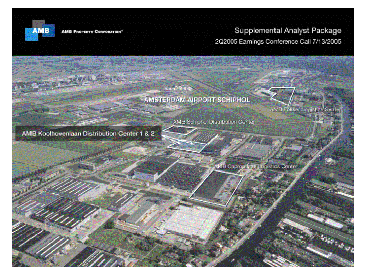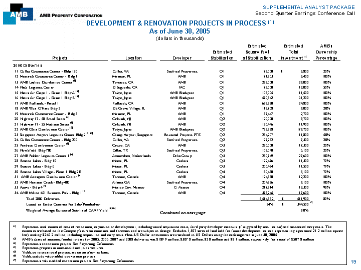 | SUPPLEMENTAL ANALYST PACKAGE Second Quarter Earnings Conference Call DEVELOPMENT & RENOVATION PROJECTS IN PROCESS (1)As of June 30, 2005 (dollars in thousands) Estimated Estimated AMB's Estimated Square Feet Total Ownership Projects Location Developer Stabilization at Stabilization Investment (1)Percentage Remaining 2005 Deliveries 1. Sterling Distribution 2 (4) Chino, CA Majestic Realty Q3 490,000 $ 17,300 40% 2. Interstate Crossdock (3) Teterboro, NJ AMB Q3 616,992 50,800 100% 3. Beacon Lakes 9 Miami, FL Codina Q3 206,656 10,200 79% 4. Platinum Triangle Land (7) Anaheim, CA AMB Q4 - 22,700 100% 5. Sterling Distribution 3 (4) Chino, CA Majestic Realty Q4 390,000 13,900 40% 6. Spinnaker Logistics (3) Redondo Beach, CA IAC Q4 279,431 28,900 39% 7. Encino Distribution Center (5) Mexico City, Mexico G Accion Q4 571,267 31,000 98% 8. AMB West O'Hare Bldg 1 Elk Grove Village, IL AMB Q4 189,240 14,900 20% 9. AMB Amagasaki Distribution Center (5) Osaka, Japan AMB Blackpine Q4 973,037 94,200 100% 10. Monarch Commerce Center - Bldg 2 Miramar, FL AMB Q4 32,151 2,300 100% Total Remaining 2005 Deliveries 3,748,774 $ 286,200 82% Leased or Under Contract For Sale/Funded-to-date 87% $ 231,100 (2)Weighted Average Estimated Stabilized GAAP Yield (5) (6) 8.8% Continued on next page (1) Represents total estimated cost of renovation, expansion or development, including initial acquisition costs, third party developer earnouts (if triggered by stabilization) and associated carry costs. The estimates are based on the Company's current estimates and forecasts and are subject to change. Excludes 1,307 acres of land held for future development or sale (representing a potential 21.2 million square feet) totaling $240.2 million, including acquisition and carry costs. Non-US Dollar investments are translated to US Dollars using the exchange rate at June 30, 2005. (2) AMB's share of amounts funded to date for 2005, 2006, 2007 and 2008 deliveries was $189.9 million, $307.8 million, $2.0 million and $8.1 million, respectively, for a total of $507.8 million. (3) Represents a renovation project. See Reporting Definitions. (4) Represents projects in unconsolidated joint ventures. (5) Yields on international projects are on an after-tax basis. (6) Yields exclude value-added conversion projects. (7) Represents a value-added conversion project. See Reporting Definitions. 18 |