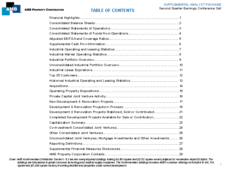 | SUPPLEMENTAL ANALYST PACKAGE Second Quarter Earnings Conference Call TABLE OF CONTENTS Financial Highlights 1 Consolidated Balance Sheets 2 Consolidated Statements of Operations 3 Consolidated Statements of Funds from Operations 4 Adjusted EBITDA and Coverage Ratios 5 Supplemental Cash Flow Information 6 Industrial Operating and Leasing Statistics 7 Industrial Market Operating Statistics 8 Industrial Portfolio Overview 9 Unconsolidated Industrial Portfolio Overview 10 Industrial Lease Expirations 11 Top 25 Customers 12 Historical Industrial Operating and Leasing Statistics 13 Acquisitions 14 Operating Property Dispositions 15 Private Capital Joint Venture Activity 16 New Development & Renovation Projects 17 Development & Renovation Projects in Process 18 Development & Renovation Projects Stabilized, Sold or Contributed 21 Completed Development Projects Available for Sale or Contribution 22 Capitalization Summary 23 Co-Investment Consolidated Joint Ventures 24 Other Consolidated Joint Ventures 25 Unconsolidated Joint Ventures, Mortgage Investments and Other Investments 26 Reporting Definitions 27 Supplemental Financial Measures Disclosures 28 AMB Property Corporation Contacts 29 Cover: AMB Koolhovenlaan Distribution Centers 1 & 2 are two newly acquired buildings totaling 89,685 square feet (8,332 square meters) adjacent to Amsterdam Airport Schiphol. The buildings are fully leased to global consumer technology and medical supply companies. The Koolhovenlaan buildings increase AMB's customer offerings at Schiphol to 941,754 square feet (87,489 square meters) of existing facilities and properties under current development. i |