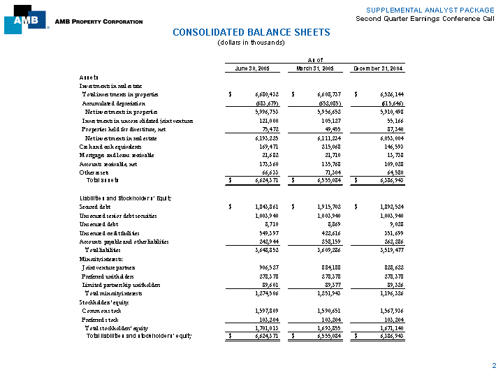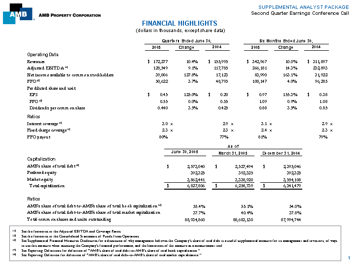 | SUPPLEMENTAL ANALYST PACKAGE Second Quarter Earnings Conference Call FINANCIAL HIGHLIGHTS (dollars in thousands, except share data) Quarters Ended June 30, Six Months Ended June 30, 2005 Change 2004 2005 Change 2004 Operating Data Revenues $ 172,277 10.4% $ 155,995 $ 342,967 10.0% $ 311,897 Adjusted EBITDA (1) 128,549 9.1% 117,785 266,181 14.3% 232,893 Net income available to common stockholders 39,006 127.8% 17,123 83,990 163.1% 31,922 FFO (2) 50,622 3.7% 48,795 100,147 4.0% 96,285 Per diluted share and unit: EPS $ 0.45 125.0% $ 0.20 $ 0.97 155.3% $ 0.38 FFO (2) 0.55 0.0% 0.55 1.09 0.9% 1.08 Dividends per common share 0.440 3.5% 0.425 0.88 3.5% 0.85 Ratios Interest coverage (1) 3.0 x 2.9 x 3.1 x 2.9 x Fixed charge coverage (1) 2.3 x 2.3 x 2.4 x 2.3 x FFO payout 80% 77% 81% 79% As of June 30, 2005 March 31, 2005 December 31, 2004 Capitalization AMB's share of total debt (3) $ 2,573,040 $ 2,527,494 $ 2,395,046 Preferred equity 392,325 392,325 392,325 Market equity 3,862,441 3,338,920 3,554,108 Total capitalization $ 6,827,806 $ 6,258,739 $ 6,341,479 Ratios AMB's share of total debt-to-AMB's share of total book capitalization (3) 55.4% 55.1% 54.0% AMB's share of total debt-to-AMB's share of total market capitalization 37.7% 40.4% 37.8% Total common shares and units outstanding 88,934,860 88,683,130 87,994,744 (1) See the footnotes to the Adjusted EBITDA and Coverage Ratios. (2) See the footnotes to the Consolidated Statements of Funds from Operations. (3) See Supplemental Financial Measures Disclosures for a discussion of why management believes the Company's share of total debt is a useful supplemental measure for its management and investors, of ways to use this measure when assessing the Company's financial performance, and the limitations of the measure as ameasurement tool. (4) See Reporting Definitions for definition of AMB's share of total debt-to-AMB's share of total book capitalization. (5) See Reporting Definition for definition of AMB's share of total debt-to-AMB's share of total market capitalization. 1 |