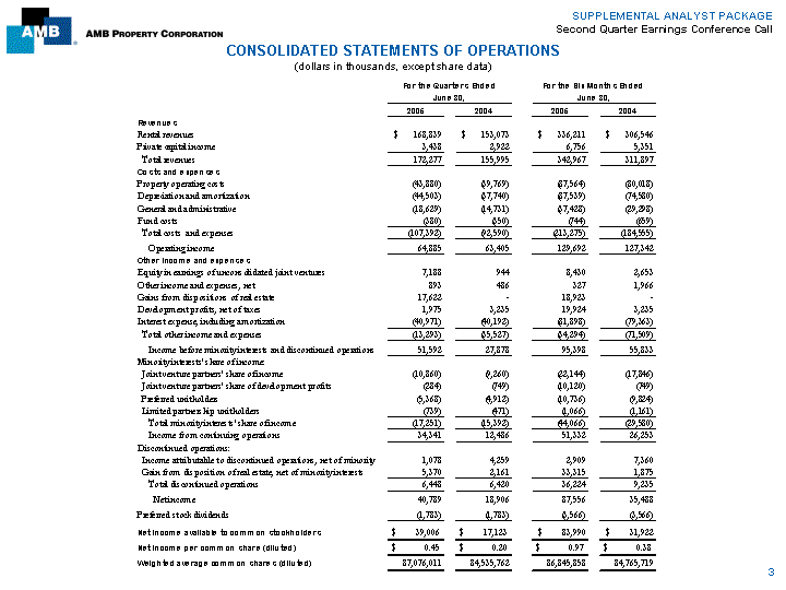 | SUPPLEMENTAL ANALYST PACKAGE Second Quarter Earnings Conference Call CONSOLIDATED STATEMENTS OF FUNDS FROM OPERATIONS (1) (dollars in thousands, except share data) For the Quarters Ended For the Six Months Ended June 30, June 30, 2005 2004 2005 2004 Net income $ 40,789 $ 18,906 $ 87,556 $ 35,488 Gain from disposition of real estate, net of minority interests (22,992) (2,161) (52,238) (1,875) Depreciation and amortization: Total depreciation and amortization 44,503 37,740 87,539 74,580 Discontinued operations' depreciation 427 2,719 1,513 5,527 Non-real estate depreciation (802) (161) (1,547) (336) Adjustments to derive FFO from consolidated JVs: Joint venture partners' minority interests (Net income) 10,860 9,260 22,144 17,846 Limited partnership unitholders' minority interests (Net income) 739 471 1,066 1,161 Limited partnership unitholders' minority interests (Development profits) 94 143 552 143 Discontinued operations' minority interests (Net income) 168 788 591 1,521 FFO attributable to minority interests (24,103) (18,118) (47,690) (35,979) Adjustments to derive FFO from unconsolidated JVs: AMB's share of net income (7,188) (944) (8,430) (2,653) AMB's share of FFO 4,469 1,935 7,216 4,428 AMB's share of development profits, net of taxes 5,441 - 5,441 - Preferred stock dividends (1,783) (1,783) (3,566) (3,566) Funds from operations $ 50,622 $ 48,795 $ 100,147 $ 96,285 FFO per common share and unit (diluted) $ 0.55 $ 0.55 $ 1.09 $ 1.08 Weighted average common shares and units (diluted) 91,795,834 89,288,954 91,566,987 89,520,249 (1) See Supplemental Financial Measures Disclosures for a discussion of why management believes FFO is a useful supplemental measure of operating performance, of ways in which investors might use FFO when assessing AMB's financial performance, and of FFO's limitations as a measurement tool. 4 |