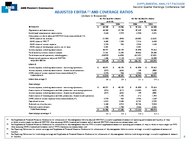 | SUPPLEMENTAL ANALYST PACKAGE Second Quarter Earnings Conference Call ADJUSTED EBITDA (1) AND COVERAGE RATIOS For the Quarters Ended For the Six Months Ended For the Quarters Ended June 30, June 30, March 31, 2005 2004 2005 2004 2005 2004 Net income $40,789 $18,906 $87,556 $35,488 $46,767 $16,582 Depreciation and amortization 44,503 37,740 87,539 74,580 43,485 37,255 Stock-based compensation amortization 2,664 2,919 6,944 5,476 4,280 2,557 Adjustments to derive adjusted EBITDA from unconsolidated JVs: AMB's share of net income (7,188) (944) (8,430) (2,653) (1,242) (1,709) AMB's share of FFO (2) 4,469 1,935 7,216 4,428 2,747 2,493 AMB's share of interest expense 2,274 955 3,936 1,658 1,662 703 AMB's share of development profits, net of taxes 5,441 - 5,441 - Interest expense, including amortization 40,971 40,192 81,898 79,363 40,896 39,018 Total minority interests' share of income 17,251 15,392 44,066 29,580 26,841 14,228 Total discontinued operations, including gains losses (24,070) (6,420) (55,147) (9,235) (29,281) (2,109) Discontinued operations' adjusted EBITDA 1,445 7,110 5,162 14,208 2,778 6,090 Adjusted EBITDA $128,549 $117,785 $266,181 $232,893 $138,933 $115,108 Interest Interest expense, including amortization - continuing operations $40,971 $40,192 $81,898 $79,363 $40,896 $39,018 Interest expense, including amortization - discontinued operations (227) (656) 149 (200) $407 $609 AMB's share of interest expense from unconsolidated JVs 2,274 955 3,936 1,658 $1,662 $703 Total interest $43,018 $40,491 $85,983 $80,821 $42,965 $40,330 Interest coverage (3) 3.0 x 2.9 x 3.1 x 2.9 x 3.2 x 2.9 x Fixed charge Interest expense, including amortization - continuing operations $40,971 $40,192 $81,898 $79,363 $40,896 $39,018 Amortization of financing costs and debt premiums - continuing operations (576) (311) (1,660) (659) $(1,084) $(329) Interest expense, including amortization - discontinued operations (227) (656) 149 (200) $407 $609 Amortization of financing costs and debt premiums - discontinued operations - 1,376 (11) 1,393 $(11) $(2) AMB's share of interest expense from unconsolidated JVs 2,274 955 3,936 1,658 $1,662 $703 Capitalized interest 6,813 3,435 13,741 5,929 $6,928 $2,494 Preferred unit distributions 5,368 4,912 10,736 9,824 $5,368 $4,912 Preferred stock dividends 1,783 1,783 3,566 3,566 $1,783 $1,783 Total fixed charge $56,406 $51,686 $112,355 $100,874 $55,949 $49,188 Fixed charge coverage (4) 2.3 x 2.3 x 2.4 x 2.3 x 2.5 x 2.3 x (dollars in thousands) 5 (1) See Supplemental Financial Measures Disclosures for a discussion of why management believes adjusted EBITDA is a useful supplemental measure of operating performance and liquidity, of ways in which investors might use adjusted EBITDA when assessing AMB's financial performance, and of adjusted EBITDA's limitations as a measurement tool. (2) See Supplemental Financial Measures Disclosures for a discussion of why management believes FFO is a useful supplemental measure of operating performance, of ways in which investors might use FFO when assessing AMB's financial performance, and of FFO's limitations as a measurement tool. (3) See Reporting Definitions for interest coverage and Supplemental Financial Measures Disclosures for a discussion of why management believes interest coverage is a useful supplemental measure of liquidity. (4) See Reporting Definitions for fixed charge coverage and Supplemental Financial Measures Disclosures for a discussion of why management believes fixed charge coverage is a useful supplemental measure of liquidity. |