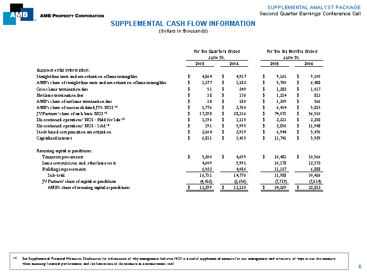 | SUPPLEMENTAL ANALYST PACKAGE Second Quarter Earnings Conference Call SUPPLEMENTAL CASH FLOW INFORMATION (dollars in thousands) For the Quarters Ended For the Six Months Ended June 30, June 30, 2005 2004 2005 2004 Supplemental Information: Straight-line rents and amortization of lease intangibles $ 4,864 $ 4,937 $ 9,361 $ 9,105 AMB's share of straight-line rents and amortization of lease intangibles $ 3,277 $ 3,182 $ 5,700 $ 6,488 Gross lease termination fees $ 51 $ 249 $ 1,282 $ 1,017 Net lease termination fees $ 38 $ 176 $ 1,214 $ 813 AMB's share of net lease termination fees $ 38 $ 180 $ 1,209 $ 566 AMB's share of unconsolidated JV's NOI (1) $ 1,776 $ 2,760 $ 6,414 $ 5,815 JV Partners' share of cash basis NOI (1) $ 37,298 $ 28,336 $ 74,073 $ 56,510 Discontinued operations' NOI - Held for Sale (1) $ 1,196 $ 1,110 $ 2,233 $ 2,208 Discontinued operations' NOI - Sold (1) $ 191 $ 5,995 $ 2,856 $ 11,948 Stock-based compensation amortization $ 2,664 $ 2,919 $ 6,944 $ 5,476 Capitalized interest $ 6,813 $ 3,435 $ 13,741 $ 5,929 Recurring capital expenditures: Tenant improvements $ 5,200 $ 4,699 $ 10,483 $ 10,966 Lease commissions and other lease costs 4,609 5,991 10,178 12,572 Building improvements 6,922 4,086 11,327 6,888 Sub-total 16,731 14,776 31,988 30,426 JV Partners' share of capital expenditures (4,432) (2,656) (7,719) (7,614) AMB's share of recurring capital expenditures $ 12,299 $ 12,120 $ 24,269 $ 22,812 (1) See Supplemental Financial Measures Disclosures for a discussion of why management believes NOI is a useful supplemental measure for our management and investors, of ways to use this measure when assessing financial performance, and the limitations of the measure as a measurement tool. 6 |