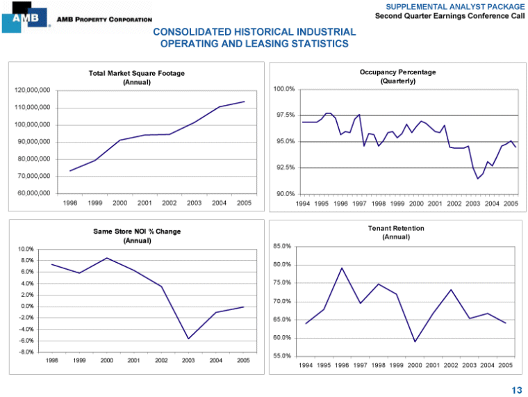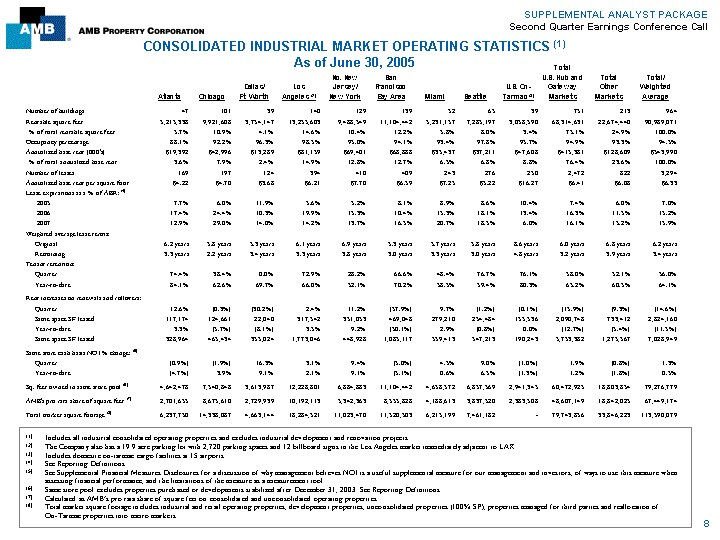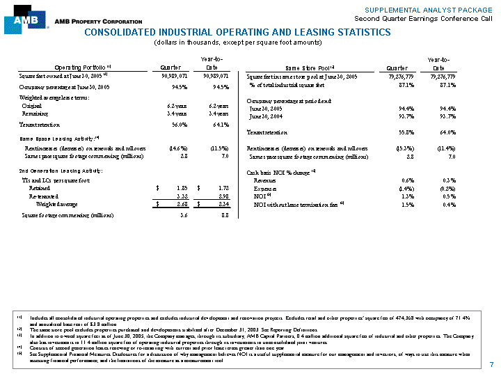 | SUPPLEMENTAL ANALYST PACKAGE Second Quarter Earnings Conference Call CONSOLIDATED INDUSTRIAL OPERATING AND LEASING STATISTICS (dollars in thousands, except per square foot amounts) Year-to- Year-to- Operating Portfolio (1) Quarter Date Same Store Pool(2) Quarter Date Square feet owned at June 30, 2005 (3) 90,989,071 90,989,071 Square feet in same store pool at June 30, 2005 79,276,779 79,276,779 Occupancy percentage at June 30, 2005 94.5% 94.5% % of total industrial square feet 87.1% 87.1% Weighted average lease terms: Occupancy percentage at period end: Original 6.2 years 6.2 years June 30, 2005 94.4% 94.4% Remaining 3.4 years 3.4 years June 30, 2004 93.7% 93.7% Tenant retention 56.0% 64.1% Tenant retention 55.8% 64.0% Same Space Leasing Activity: (4) Rent increases (decreases) on renewals and rollovers (14.6%) (11.5%) Rent increases (decreases) on renewals and rollovers (15.3%) (11.4%) Same space square footage commencing (millions) 2.8 7.0 Same space square footage commencing (millions) 2.8 7.0 2nd Generation Leasing Activity: Cash basis NOI % change: (5) TIs and LCs per square foot: Revenues 0.6% 0.3% Retained $ 1.85 $ 1.72 Expenses (1.4%) (0.2%) Re-tenanted 3.32 2.98 NOI (5) 1.3% 0.5% Weighted average $ 2.68 $ 2.34 NOI without lease termination fees (5) 1.5% 0.4% Square footage commencing (millions) 3.6 8.8 (1) Includes all consolidated industrial operating properties and excludes industrial development and renovation projects. Excludes retail and other properties' square feet of 474,368 with occupancy of 71.4% and annualized base rent of $3.8 million. (2) The same store pool excludes properties purchased and developments stabilized after December 31, 2003. See Reporting Definitions. (3) In addition to owned square feet as of June 30, 2005, the Company manages, through its subsidiary, AMB Capital Partners, 0.4 million additional square feet of industrial and other properties. The Company also has investments in 11.4 million square feet of operating industrial properties through its investments in unconsolidated joint ventures. (4) Consists of second generation leases renewing or re-tenanting with current and prior lease terms greater than one year. (5) See Supplemental Financial Measures Disclosures for a discussion of why management believes NOI is a useful supplemental measure for our management and investors, of ways to use this measure when assessing financial performance, and the limitations of the measure as a measurement tool. 7 |