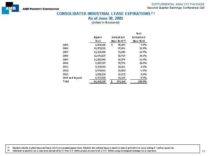 | SUPPLEMENTAL ANALYST PACKAGE Second Quarter Earnings Conference Call CONSOLIDATED INDUSTRIAL LEASE EXPIRATIONS (1)As of June 30, 2005 (dollars in thousands) % of Square Annualized Annualized Feet Base Rent (2) Base Rent 2005 6,002,588 $ 40,609 7.0% 2006 14,272,333 87,496 15.2% 2007 15,138,248 91,820 15.9% 2008 13,696,037 83,919 14.6% 2009 11,283,843 68,574 11.9% 2010 9,529,987 70,970 12.3% 2011 4,195,051 32,551 5.6% 2012 3,978,061 35,202 6.1% 2013 1,322,155 14,372 2.5% 2014 and beyond 6,767,026 51,155 8.9% Total 86,185,329 $ 576,668 100.0% (1) Schedule includes in-place leases and leases with future commencement dates. Schedule also includes leases in month-to-month and hold-over status totaling 2.1 million square feet. (2) Calculated as monthly rent at expiration multiplied by 12. Non-U.S. Dollar projects are converted to U.S. Dollars using the budgeted exchange rate at expiration. 11 |