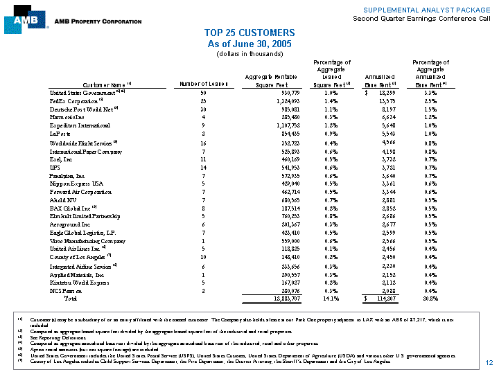 | SUPPLEMENTAL ANALYST PACKAGE Second Quarter Earnings Conference Call TOP 25 CUSTOMERS As of June 30, 2005 (dollars in thousands) Percentage of Percentage of Aggregate Aggregate Aggregate Rentable Leased Annualized Annualized Customer Name (1) Number of Leases Square Feet Square Feet (2) Base Rent (3) Base Rent (4) United States Government (5) (6) 50 930,779 1.0% $ 18,299 3.3% FedEx Corporation (5) 25 1,324,093 1.4% 13,575 2.5% Deutsche Post World Net (5) 30 985,081 1.1% 8,197 1.5% Harmonic Inc. 4 285,480 0.3% 6,634 1.2% Expeditors International 9 1,107,752 1.2% 5,648 1.0% La Poste 2 854,435 0.9% 5,543 1.0% Worldwide Flight Services (5) 16 352,723 0.4% 4,566 0.8% International Paper Company 7 525,893 0.6% 4,198 0.8% Exel, Inc. 11 460,169 0.5% 3,732 0.7% UPS 14 541,953 0.6% 3,721 0.7% Panalpina, Inc. 7 572,935 0.6% 3,640 0.7% Nippon Express USA 5 429,040 0.5% 3,361 0.6% Forward Air Corporation 7 462,714 0.5% 3,344 0.6% Ahold NV 7 680,565 0.7% 2,881 0.5% BAX Global Inc. (5) 8 187,514 0.2% 2,852 0.5% Elmhult Limited Partnership 5 760,253 0.8% 2,686 0.5% Aeroground Inc. 6 201,367 0.3% 2,677 0.5% Eagle Global Logistics, L.P. 7 423,410 0.5% 2,599 0.5% Virco Manufacturing Company 1 559,000 0.6% 2,566 0.5% United Air Lines Inc. (5) 5 118,825 0.1% 2,456 0.4% County of Los Angeles (7) 10 148,410 0.2% 2,450 0.4% Integrated Airline Services (5) 6 233,656 0.3% 2,230 0.4% Applied Materials, Inc. 1 290,557 0.3% 2,152 0.4% Kintetsu World Express 5 167,027 0.2% 2,112 0.4% NCS Pearson 2 280,076 0.3% 2,088 0.4% Total 12,883,707 14.1% $ 114,207 20.8% (1) Customer(s) may be a subsidiary of or an entity affiliated with the named customer. The Company also holds a lease at our Park One property adjacent to LAX with an ABR of $7,217, which is not included. (2) Computed as aggregate leased square feet divided by the aggregate leased square feet of the industrial and retail properties. (3) See Reporting Definitions. (4) Computed as aggregate annualized base rent divided by the aggregate annualized base rent of the industrial, retail and other properties. (5) Apron rental amounts (but not square footage) are included. (6) United States Government includes the United States Postal Service (USPS), United States Customs, United States Department of Agriculture (USDA) and various other U.S. governmental agencies. (7) County of Los Angeles includes Child Support Services Department, the Fire Department, the District Attorney, the Sheriff's Department and the City of Los Angeles. 12 |