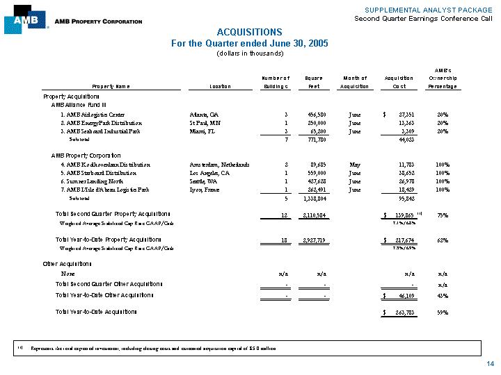 | SUPPLEMENTAL ANALYST PACKAGE Second Quarter Earnings Conference Call ACQUISITIONS For the Quarter ended June 30, 2005 (dollars in thousands) AMB's Number of Square Month of Acquisition Ownership Property Name Location Buildings Feet Acquisition Cost Percentage Property Acquisitions AMB Alliance Fund III 1. AMB Airlogistics Center Atlanta, GA 3 456,580 June $ 27,351 20% 2. AMB Energy Park Distribution St. Paul, MN 1 250,000 June 13,363 20% 3. AMB Seaboard Industrial Park Miami, FL 3 65,200 June 3,309 20% Subtotal 7 771,780 44,023 AMB Property Corporation 4. AMB Koolhovenlaan Distribution Amsterdam, Netherlands 2 89,685 May 11,783 100% 5. AMB Starboard Distribution Los Angeles, CA 1 559,000 June 38,652 100% 6. Sumner Landing North Seattle, WA 1 427,628 June 26,978 100% 7. AMB L'Isle d'Abeau Logistics Park Lyon, France 1 262,491 June 18,429 100% Subtotal 5 1,338,804 95,842 Total Second Quarter Property Acquisitions 12 2,110,584 $ 139,865 (1) 75% Weighted Average Stabilized Cap Rate GAAP/Cash 7.1%/6.8% Total Year-to-Date Property Acquisitions 18 2,927,719 $ 217,674 62% Weighted Average Stabilized Cap Rate GAAP/Cash 7.3%/6.9% Other Acquisitions None n/a n/a n/a n/a Total Second Quarter Other Acquisitions - - - n/a Total Year-to-Date Other Acquisitions - - $ 46,109 43% Total Year-to-Date Acquisitions $ 263,783 59% (1) Represents the total expected investment, including closing costs and estimated acquisition capital of $5.0 million. 14 |