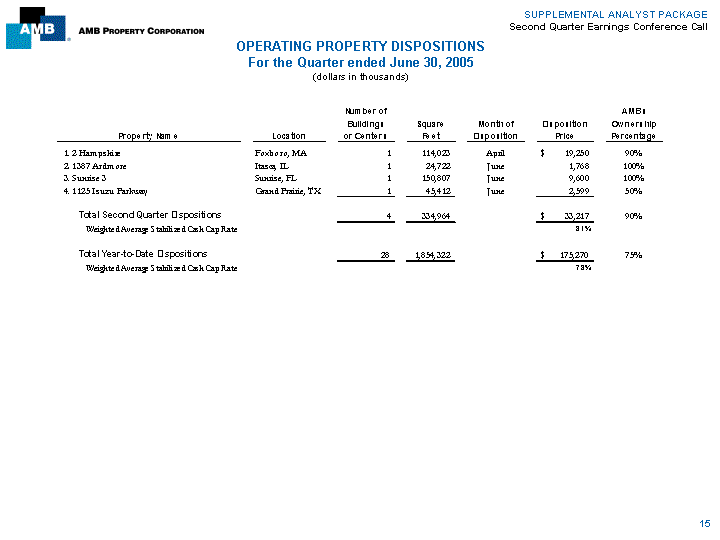 | SUPPLEMENTAL ANALYST PACKAGE Second Quarter Earnings Conference Call OPERATING PROPERTY DISPOSITIONS For the Quarter ended June 30, 2005 (dollars in thousands) Number of AMB's Buildings Square Month of Disposition Ownership Property Name Location or Centers Feet Disposition Price Percentage 1. 2 Hampshire Foxboro, MA 1 114,023 April $ 19,250 90% 2. 1387 Ardmore Itasca, IL 1 24,722 June 1,768 100% 3. Sunrise 3 Sunrise, FL 1 150,807 June 9,600 100% 4. 1125 Isuzu Parkway Grand Prairie, TX 1 45,412 June 2,599 50% Total Second Quarter Dispositions 4 334,964 $ 33,217 90% Weighted Average Stabilized Cash Cap Rate 8.1% Total Year-to-Date Dispositions 28 1,854,322 $ 175,270 75% Weighted Average Stabilized Cash Cap Rate 7.8% 15 |