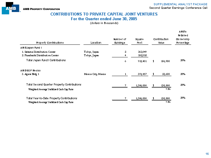 | SUPPLEMENTAL ANALYST PACKAGE Second Quarter Earnings Conference Call CONTRIBUTIONS TO PRIVATE CAPITAL JOINT VENTURES For the Quarter ended June 30, 2005 (dollars in thousands) AMB's Retained Number of Square Contribution Ownership Property Contributions Location Buildings Feet Value Percentage AMB Japan Fund I 1. Saitama Distribution Center Tokyo, Japan 2 363,049 $ 106,900 2. Funabashi Distribution Center Tokyo, Japan 4 552,352 Total Japan Fund I Contributions 6 915,401 $ 106,900 20% AMB-SGP Mexico 3. Agave Bldg 1 Mexico City, Mexico 1 391,457 $ 23,600 20% Total Second Quarter Property Contributions 7 1,306,858 $ 130,500 20% Weighted Average Stabilized Cash Cap Rate 7.5% Total Year-to-Date Property Contributions 7 1,306,858 $ 130,500 20% Weighted Average Stabilized Cash Cap Rate 7.5% 16 |