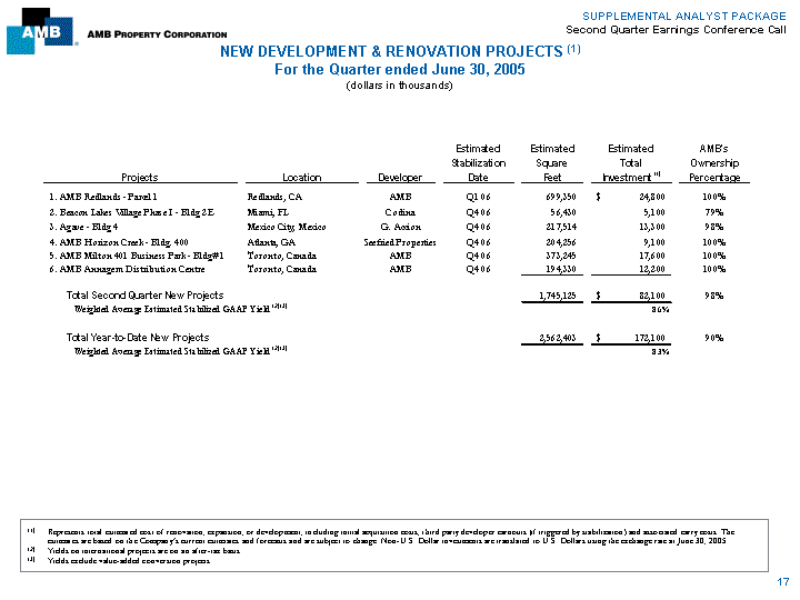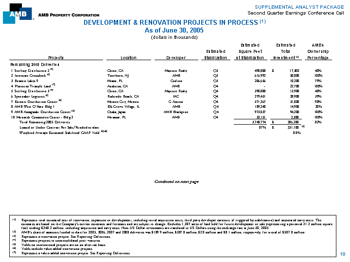 | SUPPLEMENTAL ANALYST PACKAGE Second Quarter Earnings Conference Call NEW DEVELOPMENT & RENOVATION PROJECTS (1) For the Quarter ended June 30, 2005 (dollars in thousands) Estimated Estimated Estimated AMB's Stabilization Square Total Ownership Projects Location Developer Date Feet Investment (1) Percentage 1. AMB Redlands - Parcel 1 Redlands, CA AMB Q1 06 699,350 $ 24,800 100% 2. Beacon Lakes Village Phase I - Bldg 2E Miami, FL Codina Q4 06 56,430 5,100 79% 3. Agave - Bldg 4 Mexico City, Mexico G. Accion Q4 06 217,514 13,300 98% 4. AMB Horizon Creek - Bldg. 400 Atlanta, GA Seefried Properties Q4 06 204,256 9,100 100% 5. AMB Milton 401 Business Park - Bldg#1 Toronto, Canada AMB Q4 06 373,245 17,600 100% 6. AMB Annagem Distribution Centre Toronto, Canada AMB Q4 06 194,330 12,200 100% Total Second Quarter New Projects 1,745,125 $ 82,100 98% Weighted Average Estimated Stabilized GAAP Yield (2) (3) 8.6% Total Year-to-Date New Projects 2,562,403 $ 172,100 90% Weighted Average Estimated Stabilized GAAP Yield (2) (3) 8.3% (1) Represents total estimated cost of renovation, expansion, or development, including initial acquisition costs, third party developer earnouts (if triggered by stabilization) and associated carry costs. The estimates are based on the Company's current estimates and forecasts and are subject to change. Non-U.S. Dollar investments are translated to U.S. Dollars using the exchange rate at June 30, 2005. (2) Yields on international projects are on an after-tax basis. (3) Yields exclude value-added conversion projects. 17 |