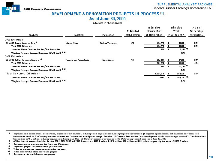 | SUPPLEMENTAL ANALYST PACKAGE Second Quarter Earnings Conference Call DEVELOPMENT ' RENOVATION PROJECTS IN PROCESS (1)As of June 30, 2005 (dollars in thousands) Estimated Estimated AMB's Estimated Square Feet Total Ownership Projects Location Developer Stabilization at Stabilization Investment (1)Percentage 2007 Deliveries 35. AMB Barajas Logistics Park (5) Madrid, Spain Codina Torimbia Q2 454,779 $ 30,600 80% Total 2007 Deliveries 454,779 $ 30,600 80% Leased or Under Contract For Sale/Funded-to-date 0% $ 2,500 (2) Weighted Average Estimated Stabilized GAAP Yield (5) (6) 9.2% 2008 Deliveries 36. AMB Fokker Logistics Center 3 (5) Amsterdam, Netherlands Delta Group Q1 313,229 $ 39,600 50% Total 2008 Deliveries 313,229 $ 39,600 50% Leased or Under Contract For Sale/Funded-to-date 0% $ 16,100 (2) Weighted Average Estimated Stabilized GAAP Yield (5) (6) 8.4% Total Scheduled Deliveries (1) 10,031,614 $ 868,300 85% Leased or Under Contract For Sale/Funded-to-date 45% $ 594,200 (2)Weighted Average Estimated Stabilized GAAP Yield (5) (6) 8.3% (1) Represents total estimated cost of renovation, expansion or development, including initial acquisition costs, third party developer earnouts (if triggered by stabilization) and associated carry costs. The estimates are based on the Company's current estimates and forecasts and are subject to change. Excludes 1,307 acres of land held for future development or sale (representing a potential 21.2 million square feet) totaling $240.2 million, including acquisition and carry costs. Non-US Dollar investments are translated to US Dollars using the exchange rate at June 30, 2005. (2) AMB's share of amounts funded to date for 2005, 2006, 2007 and 2008 deliveries was $189.9 million, $307.8 million, $2.0 million and $8.1 million, respectively, for a total of $507.8 million. (3) Represents a renovation project. See Reporting Definitions. (4) Represents projects in unconsolidated joint ventures. (5) Yields on international projects are on an after-tax basis. (6) Yields exclude value-added conversion projects. (7) Represents a value-added conversion project. 20 |