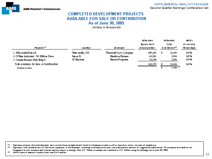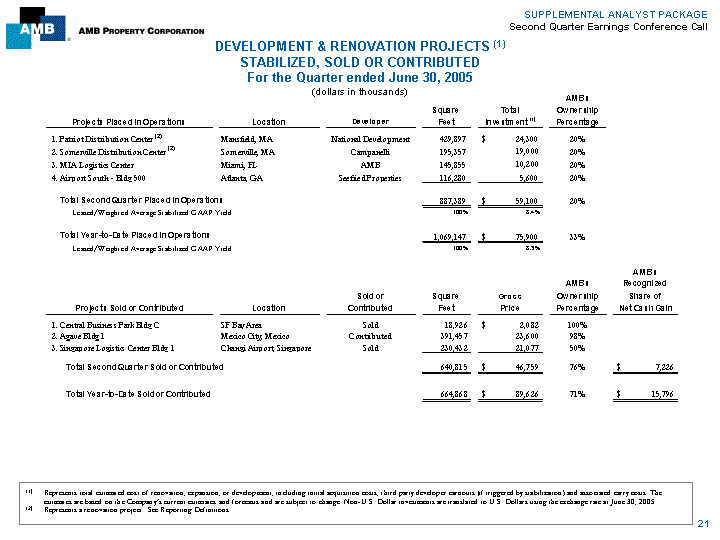 | SUPPLEMENTAL ANALYST PACKAGE Second Quarter Earnings Conference Call DEVELOPMENT & RENOVATION PROJECTS (1)STABILIZED, SOLD OR CONTRIBUTED For the Quarter ended June 30, 2005 (dollars in thousands) AMB's Square Total Ownership Projects Placed in Operations Location Developer Feet Investment (1) Percentage 1. Patriot Distribution Center (2) Mansfield, MA National Development 429,897 $ 24,300 20% 2. Somerville Distribution Center (2) Somerville, MA Campanelli 195,357 19,000 20% 3. MIA Logistics Center Miami, FL AMB 145,855 10,200 20% 4. Airport South - Bldg 500 Atlanta, GA Seefried Properties 116,280 5,600 20% Total Second Quarter Placed in Operations 887,389 $ 59,100 20% Leased/Weighted Average Stabilized GAAP Yield 100% 8.4% Total Year-to-Date Placed in Operations 1,069,147 $ 75,900 33% Leased/Weighted Average Stabilized GAAP Yield 100% 8.3% AMB's AMB's Recognized Sold or Square Gross Ownership Share of Projects Sold or Contributed Location Contributed Feet Price Percentage Net Cash Gain 1. Central Business Park Bldg C SF Bay Area Sold 18,926 $ 2,082 100% 2. Agave Bldg 1 Mexico City, Mexico Contributed 391,457 23,600 98% 3. Singapore Logistics Center Bldg 1 Changi Airport, Singapore Sold 230,432 21,077 50% Total Second Quarter Sold or Contributed 640,815 $ 46,759 76% $ 7,226 Total Year-to-Date Sold or Contributed 664,868 $ 89,626 71% $ 15,796 (1) Represents total estimated cost of renovation, expansion, or development, including initial acquisition costs, third party developer earnouts (if triggered by stabilization) and associated carry costs. The estimates are based on the Company's current estimates and forecasts and are subject to change. Non-U.S. Dollar investments are translated to U.S. Dollars using the exchange rate at June 30, 2005. (2) Represents a renovation project. See Reporting Definitions. 21 |