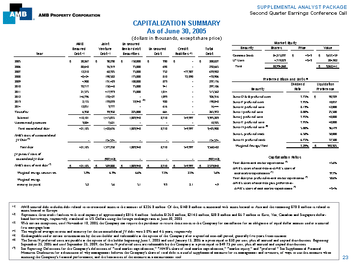 | SUPPLEMENTAL ANALYST PACKAGE Second Quarter Earnings Conference Call CAPITALIZATION SUMMARY As of June 30, 2005 (dollars in thousands, except share price) AMB Joint Unsecured Market Equity Secured Venture Senior debt Unsecured Credit Total Security Shares Price Value Year Debt (1) Debt (1) Securities Debt Facilities (2) Debt Common Stock 84,215,037 $ 43.43 $ 3,657,459 2005 $ 20,267 $ 30,230 $ 150,000 $ 330 $ - $ 200,827 LP Units 4,719,823 43.43 204,982 2006 80,648 76,319 75,000 698 - 232,665 Total 88,934,860 $ 3,862,441 2007 12,218 68,705 75,000 752 477,307 633,982 2008 40,424 190,582 175,000 810 72,090 478,906 Preferred Stock and Units (5) 2009 4,900 131,403 100,000 873 - 237,176 Dividend Liquidation 2010 70,717 150,448 75,000 941 - 297,106 Security Rate Preference 2011 21,575 417,973 75,000 1,014 - 515,562 2012 146,796 178,427 - 1,093 - 326,316 Series D & E preferred units 7.75% $ 90,789 (3) 2013 2,155 133,833 53,940 920 - 190,848 Series F preferred units 7.95% 10,057 2014 12,051 3,777 - 616 - 16,444 Series H preferred units 8.13% 42,000 Thereafter 6,350 33,358 225,000 664 - 265,372 Series I preferred units 8.00% 25,500 Sub-total 418,101 1,415,055 1,003,940 8,710 549,397 3,395,203 Series J preferred units 7.95% 40,000 Unamortized premiums 3,084 7,621 - - - 10,705 Series K preferred units 7.95% 40,000 Series N preferred units (6) 5.00% 36,479 Total consolidated debt 421,185 1,422,676 1,003,940 8,710 549,397 3,405,908 Series L preferred stock 6.50% 50,000 AMB's share of unconsolidated JV Debt (4) - 154,574 - - - 154,574 Series M preferred stock 6.75% 57,500 Weighted Average/Total 7.29% $ 392,325 Total debt 421,185 1,577,250 1,003,940 8,710 549,397 3,560,482 JV partners' share of consolidated JV debt - (987,442) - - - (987,442) Capitalization Ratios Total debt-to-total market capitalization (7) 45.6% AMB's share of total debt (7) $ 421,185 $ 589,808 $ 1,003,940 $ 8,710 $ 549,397 $ 2,573,040 AMB's share of total debt-to-AMB's share of Weighted average interest rate 5.3% 6.3% 6.6% 7.5% 2.5% 5.6% total market capitalization (7) 37.7% Weighted average Total debt plus preferred-to-total market capitalization (7) 50.6% maturity (in years) 5.2 5.6 5.1 9.3 2.1 4.9 AMB's share of total debt plus preferred-to- AMB's share of total market capitalization (7) 43.4% (1) AMB secured debt includes debt related to international assets in the amount of $226.8 million. Of this, $148.8 million is associated with assets located in Asia and the remaining $78.0 million is related to assets located in Europe. (2) Represents three credit facilities with total capacity of approximately $816.4 million. Includes $126.0 million, $214.5 million, $38.8 million and $6.7 million in Euro, Yen, Canadian and Singapore dollar-based borrowings, respectively, translated to US Dollars using the foreign exchange rates at June 30, 2005. (3) With certain exceptions, until November 10, 2005, the Company can require the purchaser to return these notes to the Company for cancellation for an obligation of equal dollar amount under a secured first mortgage loan. (4) The weighted average interest and maturity for the unconsolidated JV debt were 5.0% and 4.6 years, respectively. (5) Exchangeable under certain circumstances by the unitholderand redeemable at the option of the Company after a specified non-call period, generally five years from issuance. (6) The Series N preferred units are putable at the option of the holder beginning June 1, 2005 and until January 15, 2006 at a price equal to $50 per unit, plus all accrued and unpaid distributions. Beginning September 25, 2006 and until September 25, 2009, the Series N preferred units are redeemable by the Company at a price equal to $49.75 per unit, plus all accrued and unpaid distributions. (7) See Reporting Definitions for the Company's definitions of total market capitalization, AMB's share of total market capitalization, market equity, and preferred. See Supplemental Financial Measures Disclosures for a discussion of why management believes the Company's share of total debt is a useful supplemental measure for its management and investors, of ways to use this measure when assessing the Company's financial performance, and the limitations of the measure as ameasurement tool. 23 |