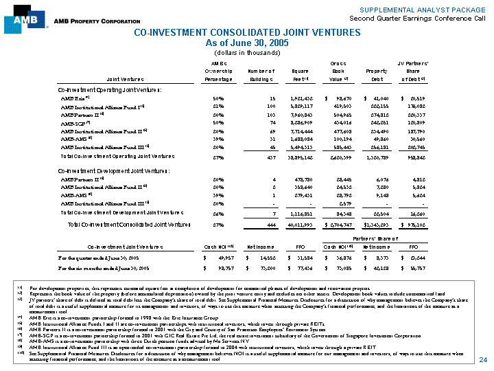 | SUPPLEMENTAL ANALYST PACKAGE Second Quarter Earnings Conference Call CO-INVESTMENT CONSOLIDATED JOINT VENTURES As of June 30, 2005 (dollars in thousands) AMB's Gross JV Partners' Ownership Number of Square Book Property Share Joint Ventures Percentage Buildings Feet (1) Value (2) Debt of Debt (3) Co-Investment Operating Joint Ventures: AMB Erie (4) 50% 15 1,921,432 $ 98,670 $ 41,040 $ 20,519 AMB Institutional Alliance Fund I (5) 21% 100 5,829,117 419,503 222,155 176,082 AMB Partners II (6) 20% 103 7,960,843 504,965 274,812 220,337 AMB-SGP (7) 50% 74 8,286,909 434,016 242,251 120,809 AMB Institutional Alliance Fund II (5) 20% 69 7,714,444 477,608 234,490 187,790 AMB-AMS (8) 39% 31 1,688,084 100,194 49,860 30,560 AMB Institutional Alliance Fund III (9) 20% 45 5,494,313 585,443 256,181 202,745 Total Co-Investment Operating Joint Ventures 27% 437 38,895,142 2,620,399 1,320,789 958,842 Co-Investment Development Joint Ventures: AMB Partners II (6) 20% 4 478,780 28,445 6,076 4,812 AMB Institutional Alliance Fund II (5) 20% 2 358,640 24,532 7,280 5,824 AMB-AMS (8) 39% 1 279,431 28,792 9,148 5,624 AMB Institutional Alliance Fund III (9) 20% - - 2,579 - - Total Co-Investment Development Joint Ventures 26% 7 1,116,851 84,348 22,504 16,260 Total Co-Investment Consolidated Joint Ventures 27% 444 40,011,993 $ 2,704,747 $1,343,293 $ 975,102 Partners' Share of Co-investment Joint Ventures Cash NOI (10) Net Income FFO Cash NOI (10) Net Income FFO For the quarter ended June 30, 2005 $ 49,957 $ 14,552 $ 31,584 $ 36,876 $ 8,373 $ 23,244 For the six months ended June 30, 2005 $ 98,757 $ 73,200 $ 77,436 $ 73,085 $ 42,128 $ 55,757 (1) For development properties, this represents estimated square feet at completion of development for committed phases of development and renovation projects. (2) Represents the book value of the property (before accumulated depreciation) owned by the joint venture entity and excludes net other assets. Development book values include uncommitted land. (3) JV partners'share of debt is defined as total debt less the Company's share of total debt. See Supplemental Financial Measures Disclosures for a discussion of why management believes the Company's share of total debt is a useful supplemental measure for its management and investors, of ways to use this measure when assessing the Company's financial performance, and the limitations of the measure as a measurement tool. (4) AMB Erie is a co-investment partnership formed in 1998 with the Erie Insurance Group. (5) AMB Institutional Alliance Funds I and II are co-investment partnerships with institutional investors, which invest through private REITs. (6) AMB Partners II is a co-investment partnership formed in 2001 with the City and County of San Francisco Employees'Retirement System. (7) AMB-SGP is a co-investment partnership formed in 2001 with GIC Real Estate Pte Ltd, the real estate investment subsidiary of the Government of Singapore Investment Corporation. (8) AMB-AMS is a co-investment partnership with three Dutch pension funds advised by Mn Services NV. (9) AMB Institutional Alliance Fund III is an open-ended co-investment partnership formed in 2004 with institutional investors, which invest through a private REIT. (10) See Supplemental Financial Measures Disclosures for a discussion of why management believes NOI is a useful supplemental measure for our management and investors, of ways to use this measure when assessing financial performance, and the limitations of the measure as a measurement tool. 24 |