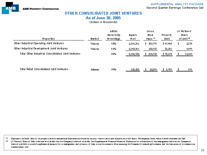 | SUPPLEMENTAL ANALYST PACKAGE Second Quarter Earnings Conference Call OTHER CONSOLIDATED JOINT VENTURES As of June 30, 2005 (dollars in thousands) AMB's Gross JV Partners' Ownership Square Book Property Share Properties Market Percentage Feet Value (1) Debt of Debt (2) Other Industrial Operating Joint Ventures Various 92% 2,301,361 $ 205,797 $ 47,408 $ 2,370 Other Industrial Development Joint Ventures Various 81% 2,342,561 128,933 23,266 9,099 Total Other Industrial Consolidated Joint Ventures 88% 4,643,922 $ 334,730 $ 70,674 $ 11,469 Total Retail Consolidated Joint Ventures Atlanta 90% 125,222 $ 22,291 $ 8,709 $ 871 (1) Represents the book value of the property (before accumulated depreciation) owned by the joint venture entity and excludes net other assets. Development book values include uncommitted land. (2) JV Partners'Share of Debt is defined as total debt less the Company's share of total debt. See Supplemental Financial Measures Disclosures for a discussion of why management believes the Company's share of total debt is a useful supplemental measure for its management and investors, of ways to use this measure when assessing the Company's financial performance, and the limitations of the measure as a measurement tool. 25 |