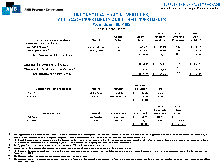 | SUPPLEMENTAL ANALYST PACKAGE Second Quarter Earnings Conference Call UNCONSOLIDATED JOINT VENTURES, MORTGAGE INVESTMENTS AND OTHER INVESTMENTS As of June 30, 2005 (dollars in thousands) AMB's AMB's AMB's Alliance Square Net Equity Ownership Share Unconsolidated Joint Ventures Market Partner Feet Investment Percentage of Debt (1)Co-Investment Joint Ventures 1. AMB-SGP Mexico (2) Various, Mexico N/A 1,647,622 $ 15,808 20% $ 3,152 2. AMB Japan Fund I (3) Various, Japan N/A 915,401 11,474 20% 10,873 2,563,023 $ 27,282 20% $ 14,025 Total Co-Investment Joint Ventures 8,805,507 $ 40,171 52% $ 85,391 Other Industrial Operating Joint Ventures 49% Other Industrial Development Joint Ventures (4) 1,209,267 7,120 16,721 Total Unconsolidated Joint Ventures 12,577,797 $ 74,573 44% $ 116,137 Mortgage Mortgage and Loan Investments Market Maturity Receivable (6) Rate 1. Pier 1 (5) SF Bay Area May 2026 $ 12,882 13.0% 2. G.Accion Various November 2006 8,800 12.0% $ 21,682 AMB's AMB's Net Ownership Share Other Investments Market Property Type Investment Percentage of Debt (1) 1. Park One Los Angeles Parking Lot $ 75,497 100% $ - 2. G.Accion (7) Various Various 46,427 39% 38,437 $ 121,924 $ 38,437 (1) See Supplemental Financial Measures Disclosures for a discussion of why management believes the Company's share of total debt is a useful supplemental measure for its management and investors, of ways to use this measure when assessing the Company's financial performance, and the limitations of the measure as ameasurement tool. (2) AMB-SGP Mexico is a co-investment partnership formed in 2004 with GIC Real Estate Pte Ltd, the real estate investment subsidiary of the Government of Singapore Investment Corporation. Includes $14.3 million of shareholder loans outstanding at June 30, 2005 between the Company and the co-investment partnership. (3) AMB Japan Fund I is a co-investment partnership formed in 2005 with institutional investors. (4) Square feet for development alliance joint ventures represents estimated square feet at completion of development project. (5) AMB has a 0.1% unconsolidated equity interest (with a 33% economic interest) in this property and also has an option to purchase the remaining equity interest beginning January 1, 2007 and expiring December 31, 2009 (6) The Company holds inter-company loans that it eliminates in consolidations. (7) The Company has a 43% unconsolidated equity interest in G.Accion, a Mexican real estate company. G.Accion provides management and development services for industrial, retail, residential and office properties in Mexico. 26 |