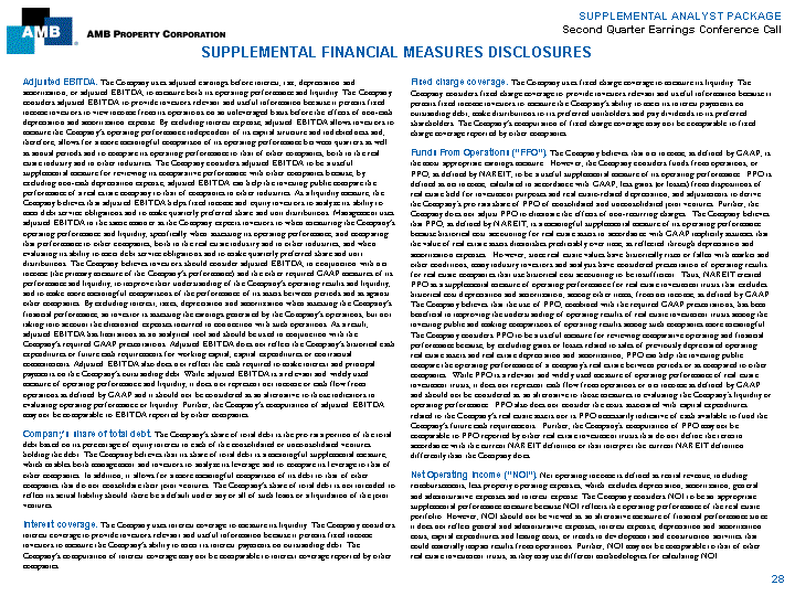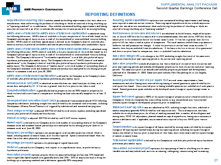 | SUPPLEMENTAL ANALYST PACKAGE Second Quarter Earnings Conference Call REPORTING DEFINITIONS Acquisition/non-recurring capex includes immediate building improvements that were taken into Recurring capital expenditures represents non-incremental building improvements and leasing consideration when underwriting the purchase of a building or which are incurred to bring a building up costs required to maintain current revenues. Recurring capital expenditures do not include acquisition to operating standard or to stabilization. Also includes incremental building improvements and leasing capital that was taken into consideration when underwriting the purchase of a building or which are costs that are incurred in an effort to substantially increase the revenue potential of an existing building. incurred to bring a building up to operating standard. AMB's share of total debt-to-AMB's share of total book capitalization is calculated using Rent increases on renewals and rollovers are calculated as the difference, weighted by square the following definitions: AMB's share of total debt is the pro rata portion of the total debt based on the feet, of the net ABR due the first month after a term commencement date and the net ABR due the last Companys percentage of equity interest in each of the consolidated or unconsolidated ventures holding month prior to the termination date of the former tenant's term. If free rent is granted, then the first the debt. AMB's share of total book capitalization is defined as the Company's share of total debt plus positive full rent value is used as a point of comparison. The rental amounts exclude base stop amounts, minority interests to preferred unitholders and limited partnership unitholders plus stockholders' equity. holdover rent and premium rent charges. If either the previous or current lease terms are under 12 AMB's share of total debt-to-AMB's share of total market capitalization is calculated using months, then they are excluded from this calculation. If the lease is the first in the unit (first generation) the following definitions: AMB's share of total debt is the pro rata portion of the total debt based on the and there is no prior lease for comparison, then it is excluded from this calculation. Company's percentage of equity interest in each of the consolidated or unconsolidated ventures holding Same store NOI growth is the change in the NOI (excluding straight-line rents) of the same store the debt. The Companys definition of total market capitalization is total debt plus preferred equity properties from the prior year reporting period to the current year reporting period. liquidation preferences plus market equity. The Company's definition of AMB's share of total market capitalization is the Company's share of total debt plus preferred equity liquidation preferences plus Same store properties include all properties that were owned as of the end of both the currentand market equity. The Company's definition of market equity is the total number of outstanding shares of prior year reporting periods and excludes development properties for both the current and prior reporting the Company's common stock and common limited partnership units multiplied by the closing price per periods. The same store pool is set annually and excludes properties purchased and developments share of its common stock as of June 30, 2005. stabilized after December 31, 2003. Same store pool includes Park One parking lot in Los Angeles, AMB's share of total market capitalization is defined by the Company as the Company's share California. of total debt plus preferred equity liquidation preferences plus market equity. Second generation TIs and LCs per square foot are total tenant improvements, lease Annualized base rent (ABR) is calculated as monthly base rent (cash basis) per the lease, as of a commissions and other leasing costs incurred during leasing of second generation space divided by the certain date, multiplied by 12. If free rent is granted, then the first positive rent value is used. total square feet leased. Costs incurred prior to leasing available space are not included until such space is leased. Second generation space excludes newly developed squarefootage or square footage vacant at Completion/Stabilization is generally defined as properties that are 90% leased or properties for acquisition. which we have held a certificate of occupancy or building has been substantially complete for at least 12 months. Square feet owned represents 100% of the square footage of properties either owned directly by the Development and renovation GAAP yields Company or which the Company has a controlling interest in (e.g. consolidated joint ventures) and are calculated from estimated annual NOI following occupancy stabilization (including straight-line rents) divided by the estimated total investment, including excludes square footage of development properties prior to completion. Development Alliance Partner-earnouts (if triggered by stabilization) and associated carrying costs. Stabilized GAAP cap rates rates are calculated as NOI, including straight-line rents, stabilized to Fixed charge coverage is adjusted EBITDA divided by total interest expense (including capitalized market occupancy (generally 95%) divided by total acquisition cost. The total acquisition cost basis interest) plus preferred dividends and distributions. includes the initial purchase price, the effects of marking assumed debt to market, all due diligence and closing costs, SFAS 141 adjustments, planned immediate capital expenditures, leasing costs necessary to Interest coverage is adjusted EBITDA divided by total GAAP interest expense. achieve stabilization and, if applicable, any estimated costs required to buy-out AMB's joint venture Market equity is defined by the Company as the total number of outstanding shares of the Company's partners. common stock and common limited partnership units multiplied by the closin