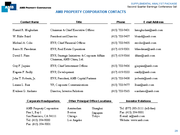 | SUPPLEMENTAL ANALYST PACKAGE Second Quarter Earnings Conference Call AMB PROPERTY CORPORATION CONTACTS Contact Name Title Phone E-mail Address Hamid R. Moghadam Chairman & Chief Executive Officer (415) 733-9401 hmoghadam@amb.com W. Blake Baird President and Director (415) 733-9407 bbaird@amb.com Michael A. Coke EVP, Chief Financial Officer (415) 733-9405 mcoke@amb.com Bruce H. Freedman EVP, Real Estate Operations (617) 619-9301 bfreedman@amb.com David S. Fries EVP, Strategic Initiatives & Corporate Affairs (617) 619-9366 dfries@amb.com Chairman, AMB China, Ltd. Guy F. Jaquier EVP, Chief Investment Officer (415) 733-9406 gjaquier@amb.com Eugene F. Reilly EVP, Development (617) 619-9333 ereilly@amb.com John T. Roberts, Jr. EVP, President, AMB Capital Partners (415) 733-9408 jroberts@amb.com Lauren L. Barr VP, Corporate Communications (415) 733-9477 lbarr@amb.com Evaleen G. Andamo Director, Investor Relations (415) 733-9565 eandamo@amb.com Corporate Headquarters Other Principal Office Locations Investor Relations AMB Property Corporation Amsterdam Shanghai Tel: (877) 285-3111 (toll-free) Pier 1, Bay 1 Boston Singapore Fax: (415) 394-9001 San Francisco, CA 94111 Chicago Tokyo E-mail: ir@amb.com Tel: (415) 394-9000 Los Angeles Website: www.amb.com Fax: (415) 394-9001 29 |