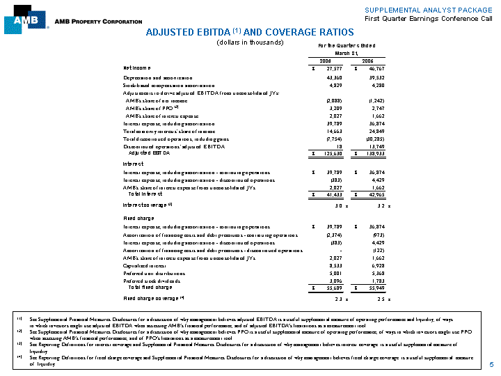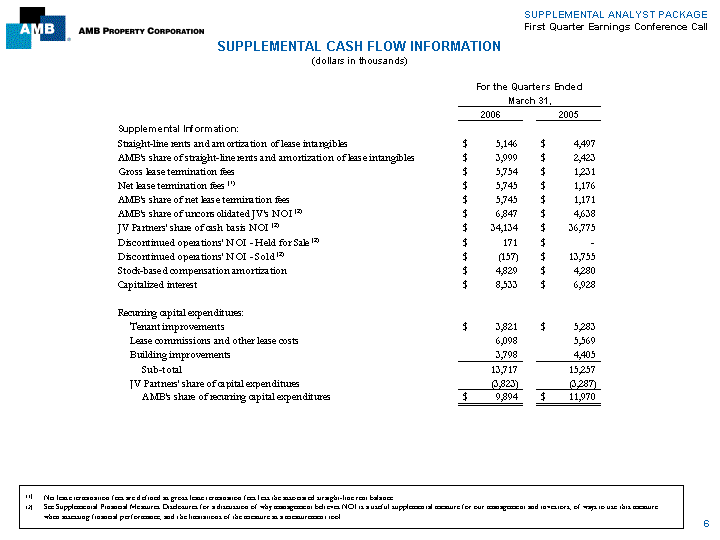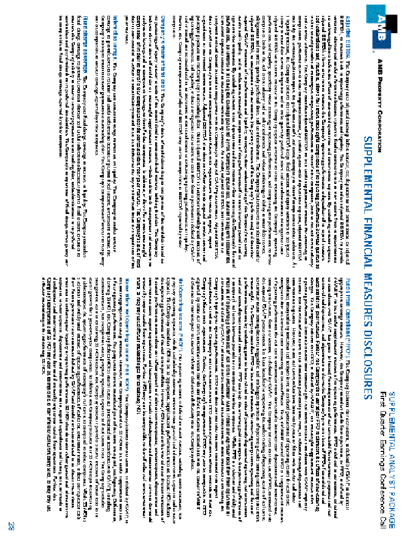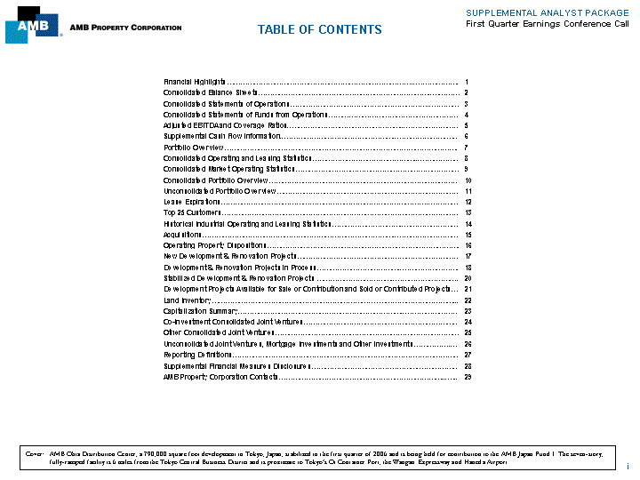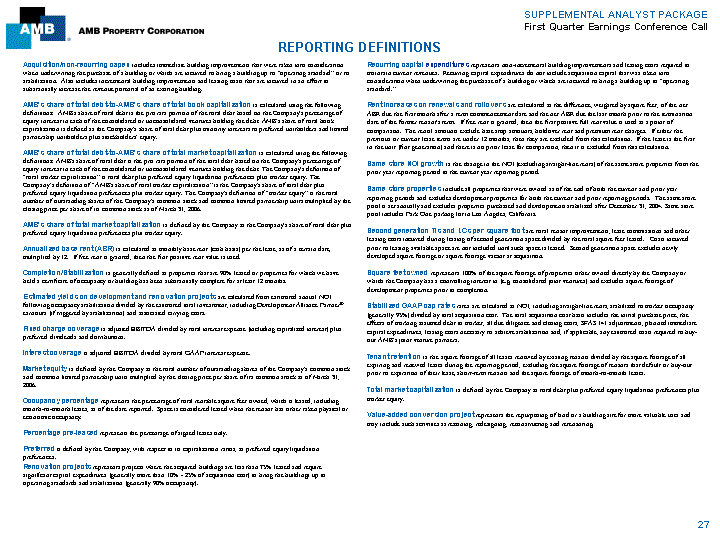 | REPORTING DEFINITIONS 27 Acquisition/non-recurring capex includes immediate building improvements that were taken into consideration when underwriting the purchase of a building or which are incurred to bring a building up to "operating standard" or to stabilization. Also includes incremental building improvements and leasing costs that are incurred in an effort to substantially increase the revenue potential of an existing building. AMB's share of total debt-to-AMB's share of total book capitalization is calculated using the following definitions: AMB's share of total debt is the pro rata portion of the total debt based on the Company's percentage of equity interest in each of the consolidated or unconsolidated ventures holding the debt. AMB's share of total book capitalization is defined as the Company's share of total debt plus minority interests to preferred unitholders and limited partnership unitholders plus stockholders' equity. AMB's share of total debt-to-AMB's share of total market capitalization is calculated using the following definitions: AMB's share of total debt is the pro rata portion of the total debt based on the Company's percentage of equity interest in each of the consolidated or unconsolidated ventures holding the debt. The Company's definition of "total market capitalization" is total debt plus preferred equity liquidation preferences plus market equity. The Company's definition of "AMB's share of total market capitalization" is the Company's share of total debt plus preferred equity liquidation preferences plus market equity. The Company's definition of "market equity" is the total number of outstanding shares of the Company's common stock and common limited partnership units multiplied by the closing price per share of its common stock as of March 31, 2006. AMB's share of total market capitalization is defined by the Company as the Company's share of total debt plus preferred equity liquidation preferences plus market equity. Annualized base rent (ABR) is calculated as monthly base rent (cash basis) per the lease, as of a certain date, multiplied by 12. If free rent is granted, then the first positive rent value is used. Completion/Stabilization is generally defined as properties that are 90% leased or properties for which we have held a certificate of occupancy or building has been substantially complete for at least 12 months. Estimated yields on development and renovation projects are calculated from estimated annual NOI following occupancy stabilization divided by the estimated total investment, including Development Alliance Partner(r) earnouts (if triggered by stabilization) and associated carrying costs. Fixed charge coverage is adjusted EBITDA divided by total interest expense (including capitalized interest) plus preferred dividends and distributions. Interest coverage is adjusted EBITDA divided by total GAAP interest expense. Market equity is defined by the Company as the total number of outstanding shares of the Company's common stock and common limited partnership units multiplied by the closing price per share of its common stock as of March 31, 2006. Occupancy percentage represents the percentage of total rentable square feet owned, which is leased, including month-to-month leases, as of the date reported. Space is considered leased when the tenant has either taken physical or economic occupancy. Percentage pre-leased represents the percentage of signed leases only. Preferred is defined by the Company, with respect to its capitalization ratios, as preferred equity liquidation preferences. Renovation projects represents projects where the acquired buildings are less than 75% leased and require significant capital expenditures (generally more than 10% - 25% of acquisition cost) to bring the buildings up to operating standards and stabilization (generally 90% occupancy). Recurring capital expenditures represents non-incremental building improvements and leasing costs required to maintain current revenues. Recurring capital expenditures do not include acquisition capital that was taken into consideration when underwriting the purchase of a building or which are incurred to bring a building up to "operating standard." Rent increases on renewals and rollovers are calculated as the difference, weighted by square feet, of the net ABR due the first month after a term commencement date and the net ABR due the last month prior to the termination date of the former tenant's term. If free rent is granted, then the first positive full rent value is used as a point of comparison. The rental amounts exclude base stop amounts, holdover rent and premium rent charges. If either the previous or current lease terms are under 12 months, then they are excluded from this calculation. If the lease is the first in the unit (first generation) and there is no prior lease for comparison, then it is excluded from this calculation. Same store NOI growth is the change in the NOI (excluding straight-line rents) of the same store properties from the prior year reporting period to the current year reporting period. Same store properties include all properties that were owned as of the end of both the current and prior year reporting periods and excludes development properties for both the current and prior reporting periods. The same store pool is set annually and excludes properties purchased and developments stabilized after December 31, 2004. Same store pool includes Park One parking lot in Los Angeles, California. Second generation TIs and LCs per square foot are total tenant improvements, lease commissions and other leasing costs incurred during leasing of second generation space divided by the total square feet leased. Costs incurred prior to leasing available space are not included until such space is leased. Second generation space excludes newly developed square footage or square footage vacant at acquisition. Square feet owned represents 100% of the square footage of pro