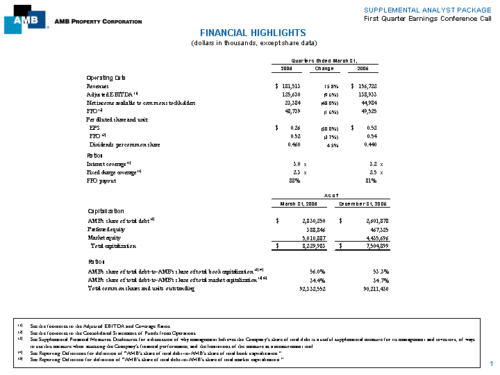 | FINANCIAL HIGHLIGHTS (dollars in thousands, except share data) (1) See the footnotes to the Adjusted EBITDA and Coverage Ratios. (2) See the footnotes to the Consolidated Statements of Funds from Operations. (3) See Supplemental Financial Measures Disclosures for a discussion of why management believes the Company's share of total debt is a useful supplemental measure for its management and investors, of ways to use this measure when assessing the Company's financial performance, and the limitations of the measure as a measurement tool. (4) See Reporting Definitions for definition of "AMB's share of total debt-to-AMB's share of total book capitalization." (5) See Reporting Definition for definition of "AMB's share of total debt-to-AMB's share of total market capitalization." 1 |