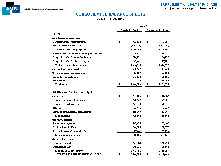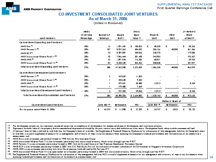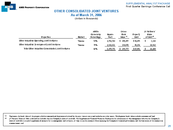 | CO-INVESTMENT CONSOLIDATED JOINT VENTURES As of March 31, 2006 (dollars in thousands) (1) For development properties, this represents estimated square feet at completion of development for committed phases of development and renovation projects. (2) Represents the book value of the property (before accumulated depreciation) owned by the joint venture entity and excludes net other assets. Development book values include uncommitted land. (3) JV partners' share of debt is defined as total debt less the Company's share of total debt. See Supplemental Financial Measures Disclosures for a discussion of why management believes the Company's share of total debt is a useful supplemental measure for its management and investors, of ways to use this measure when assessing the Company's financial performance, and the limitations of the measure as a measurement tool. (4) AMB Erie is a co-investment partnership formed in 1998 with the Erie Insurance Group. (5) AMB Institutional Alliance Fund II is a co-investment partnership with institutional investors, which invest through a private REIT. (6) AMB Partners II is a co-investment partnership formed in 2001 with the City and County of San Francisco Employees' Retirement System. (7) AMB-SGP is a co-investment partnership formed in 2001 with GIC Real Estate Pte Ltd, the real estate investment subsidiary of the Government of Singapore Investment Corporation. (8) AMB-AMS is a co-investment partnership with three Dutch pension funds advised by Mn Services NV. (9) AMB Institutional Alliance Fund III is an open-ended co-investment partnership formed in 2004 with institutional investors, which invest through a private REIT. (10) See Supplemental Financial Measures Disclosures for a discussion of why management believes NOI is a useful supplemental measure for our management and investors, of ways to use this measure when assessing financial performance, and the limitations of the measure as a measurement tool. 24 |