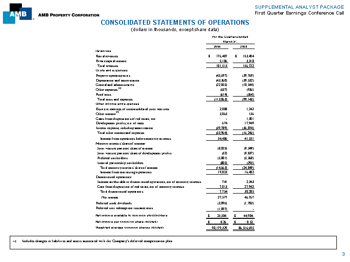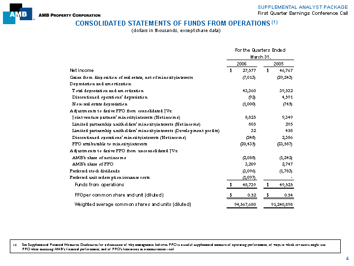 | CONSOLIDATED STATEMENTS OF FUNDS FROM OPERATIONS (1) (dollars in thousands, except share data) 4 (1) See Supplemental Financial Measures Disclosures for a discussion of why management believes FFO is a useful supplemental measure of operating performance, of ways in which investors might use FFO when assessing AMB's financial performance, and of FFO's limitations as a measurement tool. |