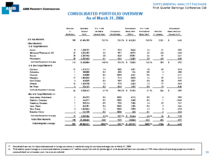 | CONSOLIDATED MARKET OPERATING STATISTICS (1) As of March 31, 2006 9 (1) Includes all consolidated operating properties and excludes unconsolidated, development and renovation projects and recently completed development projects available for sale or contribution. (2) The Company also has a 19.9 acre parking lot with 2,720 parking spaces and 12 billboard signs in the Los Angeles market immediately adjacent to LAX. (3) Includes on-tarmac cargo facilities at 14 airports. (4) See Reporting Definitions. (5) See Supplemental Financial Measures Disclosures for a discussion of why management believes NOI is a useful supplemental measure for our management and investors, of ways to use this measure when assessing the Company's financial performance, and the limitations of the measure as a measurement tool. (6) Same-store pool at March 31, 2006, excludes properties or developments stabilized after December 31, 2004. (7) Calculated as AMB's pro rata share of square feet on consolidated and unconsolidated operating properties. |