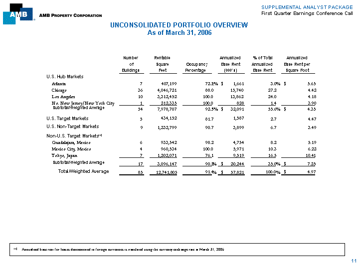 | CONSOLIDATED PORTFOLIO OVERVIEW As of March 31, 2006 10 (1) Annualized base rent for leases denominated in foreign currencies is translated using the currency exchange rate at March 31, 2006. (2) Total market square footage in international markets increases to 6.1 million square feet and the percentage of total annualized base rent increases to 7.4% when industrial operating properties owned in unconsolidated co-investment joint ventures are included. |