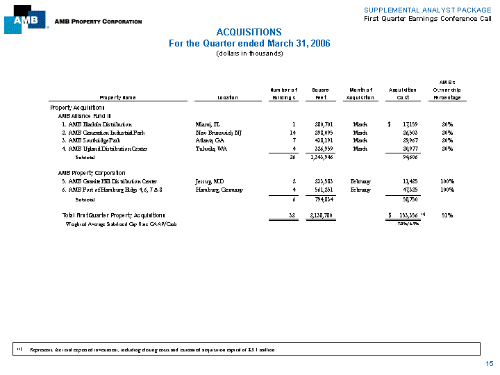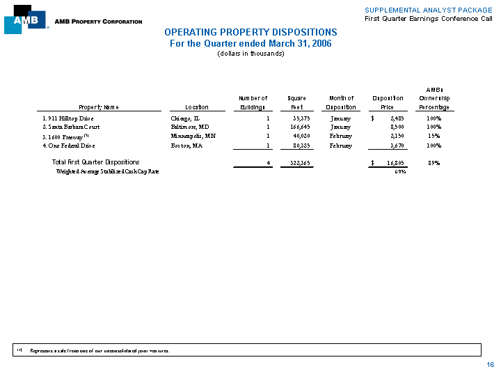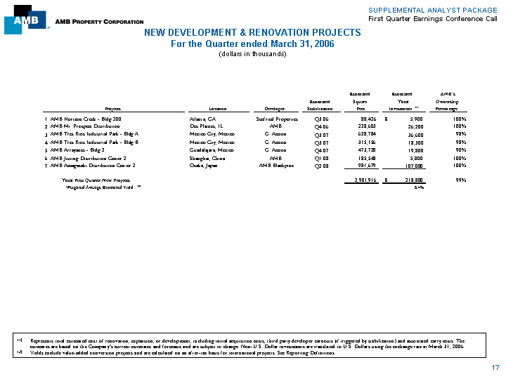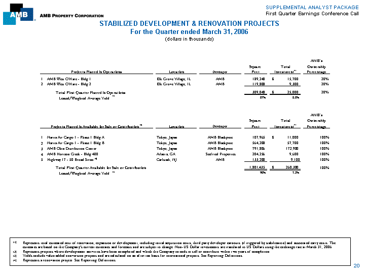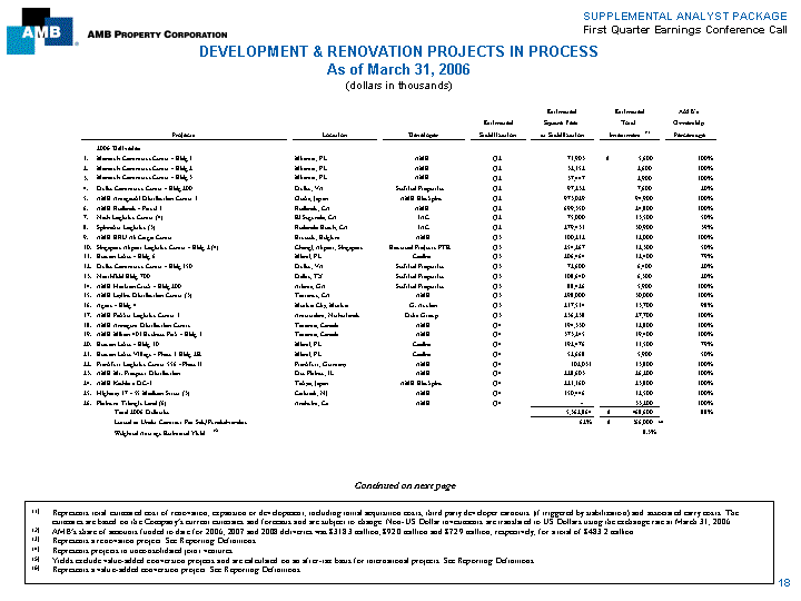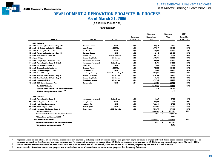 | DEVELOPMENT & RENOVATION PROJECTS IN PROCESS As of March 31, 2006 (dollars in thousands) 18 Continued on next page (1) Represents total estimated cost of renovation, expansion or development, including initial acquisition costs, third party developer earnouts (if triggered by stabilization) and associated carry costs. The estimates are based on the Company's current estimates and forecasts and are subject to change. Non-US Dollar investments are translated to US Dollars using the exchange rate at March 31, 2006. (2) AMB's share of amounts funded to date for 2006, 2007 and 2008 deliveries was $318.3 million, $92.0 million and $72.9 million, respectively, for a total of $483.2 million. (3) Represents a renovation project. See Reporting Definitions. (4) Represents projects in unconsolidated joint ventures. (5) Yields exclude value-added conversion projects and are calculated on an after-tax basis for international projects. See Reporting Definitions. (6) Represents a value-added conversion project. See Reporting Definitions. Estimated Estimated AMB's Estimated Square Feet Total Ownership Location Developer Stabilization at Stabilization Investment (1) Percentage 2006 Deliveries 1. Monarch Commerce Center - Bldg 1 Miramar, FL AMB Q2 71,903 $ 5,600 100% 2. Monarch Commerce Center - Bldg 2 Miramar, FL AMB Q2 32,152 2,600 100% 3. Monarch Commerce Center - Bldg 3 Miramar, FL AMB Q2 37,447 2,900 100% 4. Dulles Commerce Center - Bldg 200 Dulles, VA Seefried Properties Q2 97,232 7,600 20% 5. AMB Amagasaki Distribution Center 1 Osaka, Japan AMB Blackpine Q2 973,029 94,900 100% 6. AMB Redlands - Parcel 1 Redlands, CA AMB Q2 699,350 24,800 100% 7. Nash Logistics Center (4) El Segundo, CA IAC Q2 75,000 13,500 50% 8. Spinnaker Logistics (3) Redondo Beach, CA IAC Q2 279,431 30,900 39% 9. AMB BRU Air Cargo Center Brussels, Belgium AMB Q3 100,212 12,000 100% 10. Singapore Airport Logistics Center - Bldg 2 (4) Changi, Airport, Singapore Boustead Projects PTE Q3 254,267 12,300 50% 11. Beacon Lakes - Bldg 6 Miami, FL Codina Q3 206,464 12,400 79% 12. Dulles Commerce Center - Bldg 150 Dulles, VA Seefried Properties Q3 72,600 6,400 20% 13. Northfield Bldg 700 Dallas, TX Seefried Properties Q3 108,640 6,300 20% 14. AMB Horizon Creek - Bldg 200 Atlanta, GA Seefried Properties Q3 88,426 5,900 100% 15. AMB Layline Distribution Center (3) Torrance, CA AMB Q3 298,000 30,000 100% 16. Agave - Bldg 4 Mexico City, Mexico G. Accion Q3 217,514 13,700 98% 17. AMB Fokker Logistics Center 1 Amsterdam, Netherlands Delta Group Q3 236,238 27,700 100% 18. AMB Annagem Distribution Centre Toronto, Canada AMB Q4 194,330 12,800 100% 19. AMB Milton 401 Business Park - Bldg 1 Toronto, Canada AMB Q4 373,245 19,400 100% 20. Beacon Lakes - Bldg 10 Miami, FL Codina Q4 192,476 11,500 79% 21. Beacon Lakes Village - Phase 1 Bldg 2E Miami, FL Codina Q4 52,668 5,900 50% 22. Frankfurt Logistics Center 556 - Phase II Frankfurt, Germany AMB Q4 102,031 13,800 100% 23. AMB Mt. Prospect Distribution Des Plaines, IL AMB Q4 228,603 26,200 100% 24. AMB Kashiwa DC-1 Tokyo, Japan AMB Blackpine Q4 221,160 23,800 100% 25. Highway 17 - 55 Madison Street (3) Carlstadt, NJ AMB Q4 150,446 12,500 100% 26. Platinum Triangle Land (6) Anaheim, Ca AMB Q4 - 33,200 100% Total 2006 Deliveries 5,362,864 $ 468,600 88% Leased or Under Contract For Sale/Funded-to-date 62% $ 366,000 (2) Weighted Average Estimated Yield (5) 8.3% Projects |