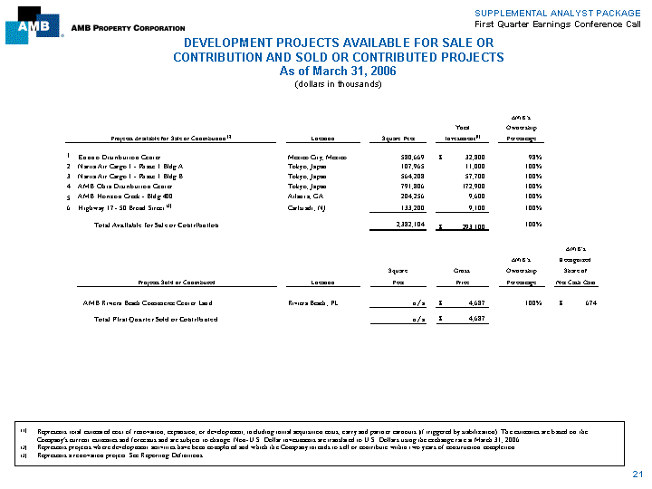 | STABILIZED DEVELOPMENT & RENOVATION PROJECTS For the Quarter ended March 31, 2006 (dollars in thousands) 20 (1) Represents total estimated cost of renovation, expansion or development, including initial acquisition costs, third party developer earnouts (if triggered by stabilization) and associated carry costs. The estimates are based on the Company's current estimates and forecasts and are subject to change. Non-US Dollar investments are translated to US Dollars using the exchange rate at March 31, 2006. (2) Represents projects where development activities have been completed and which the Company intends to sell or contribute within two years of completion. (3) Yields exclude value-added conversion projects and are calculated on an after-tax basis for international projects. See Reporting Definitions. (4) Represents a renovation project. See Reporting Definitions. AMB's Square Total Ownership Location Developer Feet Investment (1) Percentage 1. AMB West O'Hare - Bldg 1 Elk Grove Village, IL AMB 189,240 15,700 $ 20% 2. AMB West O'Hare - Bldg 2 Elk Grove Village, IL AMB 119,808 9,300 20% Total First Quarter Placed in Operations 309,048 25,000 $ 20% Leased/Weighted Average Yield (3) 87% 8.8% AMB's Square Total Ownership Location Developer Feet Investment (1) Percentage 1. Narita Air Cargo 1 - Phase 1 Bldg A Tokyo, Japan AMB Blackpine 107,965 11,000 $ 100% 2. Narita Air Cargo 1 - Phase 1 Bldg B Tokyo, Japan AMB Blackpine 564,208 57,700 100% 3. AMB Ohta Distribution Center Tokyo, Japan AMB Blackpine 791,806 172,900 100% 4. AMB Horizon Creek - Bldg 400 Atlanta, GA Seefried Properties 204,256 9,600 100% 5. Highway 17 - 50 Broad Street (4) Carlstadt, NJ AMB 133,200 9,100 100% Total First Quarter Available for Sale or Contribution 1,801,435 260,300 $ 100% Leased/Weighted Average Yield (3) 90% 7.2% Projects Placed in Operations Projects Placed in Available for Sale or Contribution (2) |