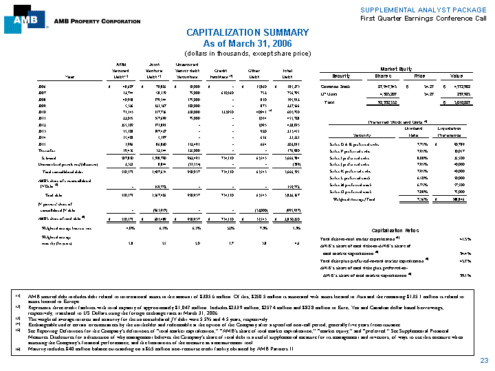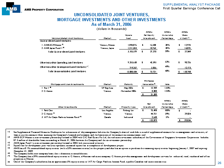 | UNCONSOLIDATED JOINT VENTURES, MORTGAGE INVESTMENTS AND OTHER INVESTMENTS As of March 31, 2006 (dollars in thousands) 26 (1) See Supplemental Financial Measures Disclosures for a discussion of why management believes the Company's share of total debt is a useful supplemental measure for its management and investors, of ways to use this measure when assessing the Company's financial performance, and the limitations of the measure as a measurement tool. (2) AMB-SGP Mexico is a co-investment partnership formed in 2004 with GIC Real Estate Pte Ltd, the real estate investment subsidiary of the Government of Singapore Investment Corporation. Includes $7.3 million of shareholder loans outstanding at March 31, 2006 between the Company and the co-investment partnership. (3) AMB Japan Fund I is a co-investment partnership formed in 2005 with institutional investors. (4) Square feet for development joint ventures represents estimated square feet at completion of development project. (5) AMB has a 0.1% unconsolidated equity interest (with a 33% economic interest) in this property and also has an option to purchase the remaining equity interest beginning January 1, 2007 and expiring December 31, 2009. (6) The Company holds inter-company loans that it eliminates in consolidations. (7) The Company has a 39% unconsolidated equity interest in G.Accion, a Mexican real estate company. G.Accion provides management and development services for industrial, retail, residential and office properties in Mexico. (8) One of the Company's subsidiaries has an approximate 5% equity interest in IAT Air Cargo Facilities Income Fund, a public Canadian real estate income trust. |