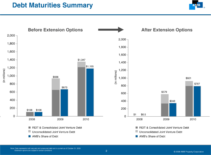 | 2008 2008 2009 2009 2009 2010 2010 REIT & Consolidated Joint Venture Debt 0 322 815 Unconsolidated Debt 1 237 126 AMB's Share of Debt 0.5 338 797 Debt Maturities Summary 2008 2009 2010 After Extension Options Before Extension Options 2008 2009 2010 (in millions) (in millions) Note: Date represents both secured and unsecured debt. Extension options are subject to certain conditions $13 $13 $756 $1,009 $1,368 $1,196 $0.5 $1 $338 $559 $941 $797 2008 2008 2009 2009 2009 2010 2010 REIT & Consolidated Joint Venture Debt 0 12 732 1242 Unconsolidated Debt 1 276 126 AMB's Share of Debt 13 756 1196 REIT & Consolidated Joint Venture Debt Unconsolidated Joint Venture Debt AMB's Share of Debt REIT & Consolidated Joint Venture Debt Unconsolidated Joint Venture Debt AMB's Share of Debt |