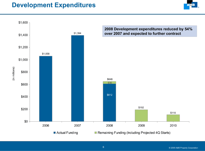 | 2006 2007 2008 2009 2010 Actual Funding 1058 1394 612 Remaining Funding (Including 4Q Starts) 36 191 109 Development Expenditures (in millions) $1,058 $1,394 $36 $612 $191 $109 $648 Development expenditures significantly reduced with only $338 million of remaining funding required to complete the development pipeline |